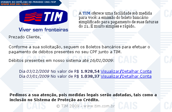 | comentário | Fraude que utiliza o nome da operadora TIM. O usuário é alertado sobre um débito na sua conta de celular e é instruído a visualizar um boleto bancário. Os links para "Visualisar/Detalhar conta" apontam para um software malicioso identificado como New Malware.ac... (leia mais) | |