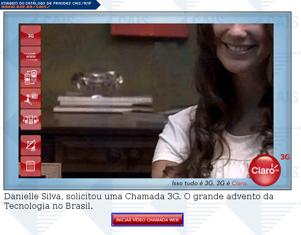 | comentário | Fraude que usa o nome da operadora Claro. A mensagem traz um link para uma suposta "Video Chamada Web 3G", de uma mulher identificada como "Danielle Silva". O software malicioso baixado é o W32/Downloader (F-Secure). | |