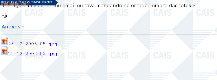 | comentário | Mensagem de uma suposta amiga enviando fotos. O link para as fotos leva a um arquivo malicioso, identificado como Trojan-Downloader.Win32.Banload.zwb (Karspersky). | |