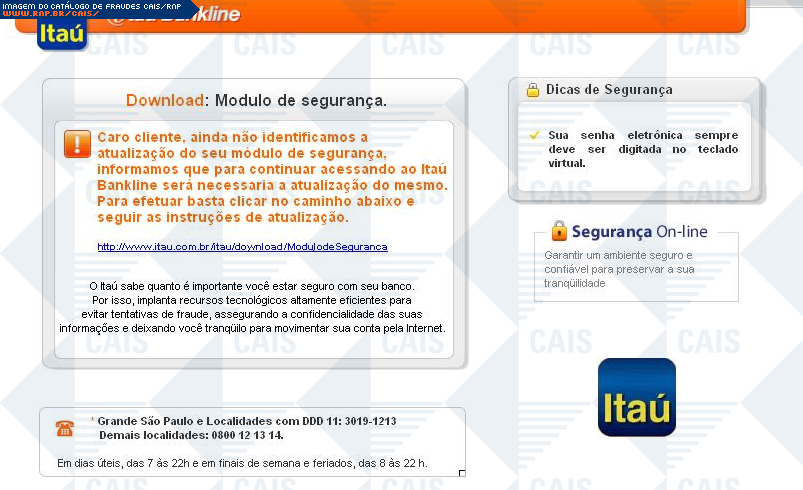 | comentário | Mensagem que se passa por um comunicado do banco Itaú, que informa o usuário sobre uma atualização no módulo de segurança, necessária para acesso ao Bankline. O link com a suposta atualização direciona o usuário para baixar o software malicioso "modulo-bankline3.1.exe",... (leia mais) | |