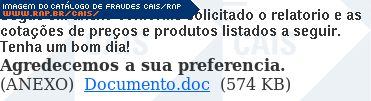 | comentário | Fraude que supostamente informa as cotações de preços de alguns produtos. O link para o malware já não se encontrava ativo no momento da análise. | |