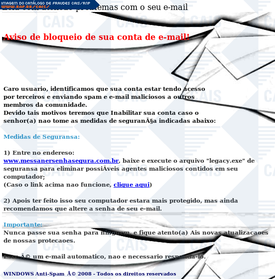 Esta página tem função informativa e educativa. Exibe uma coleção de imagens de phishing scam (fraudes eletrônicas) ou malware (código malicioso) veiculados por meio de spam (e-mail não-solicitado). Trata-se de conteúdo exemplificativo, não exaustivo, uma vez que não é possível contemplar todos os casos de fraudes existentes. Assim, caso você tenha conhecimento de um exemplar que não esteja aqui presente, isto não significa que não seja válido ou real. Inclusive incentivamos que você o envie para análise do CAIS para que, se for o caso, passe a integrar o nosso acervo.