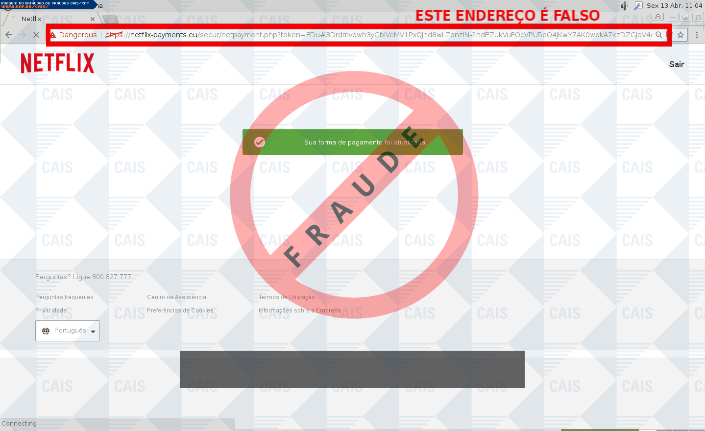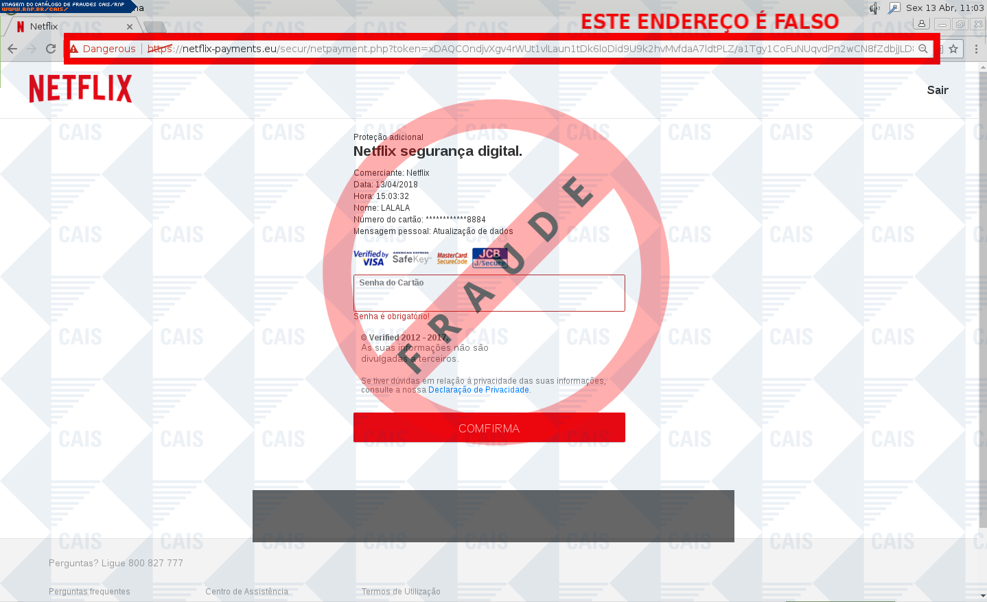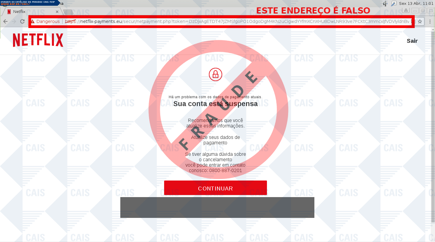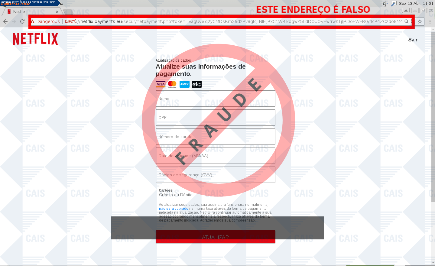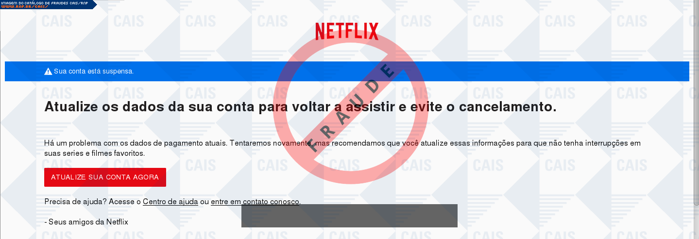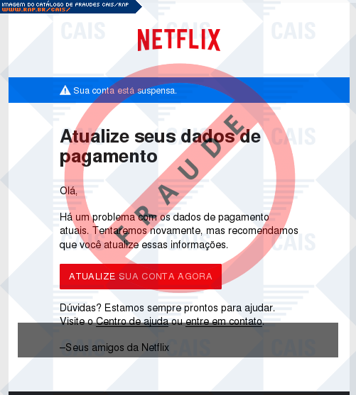 | comentário | O usuário recebe uma mensagem informando que para continuar utilizando os serviços Netflix será necessário atualizar seus dados de pagamento disponíveis no link, entretanto a página é falsa criada para roubar os dados bancários da vítima. | |