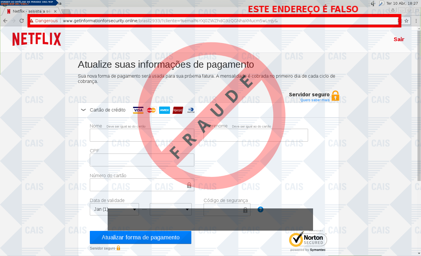 | comentário | O usuário recebe uma mensagem informando que para continuar utilizando os serviços Netflix será necessário atualizar algumas informações disponível no link, entretanto a página é falsa criada para roubar os dados do e-mail da vítima. | |