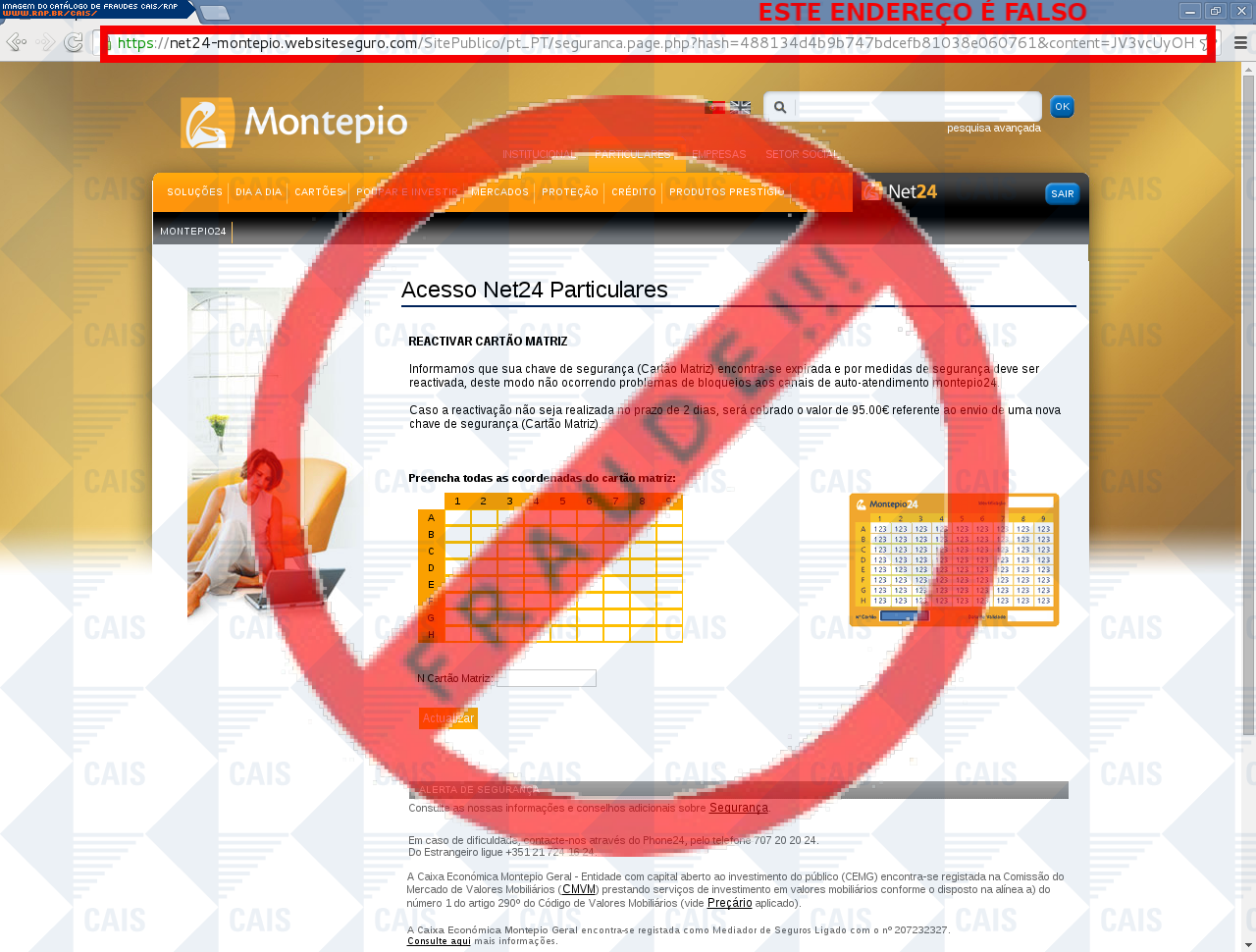 | comentário | A vítima recebe uma mensagem informando que sua conta no banco Montepio deve realizar uma troca do dispositivo de segurança no link disponibilizado, no entanto a página é falsa destinada a roubar as informações do usuário. | |