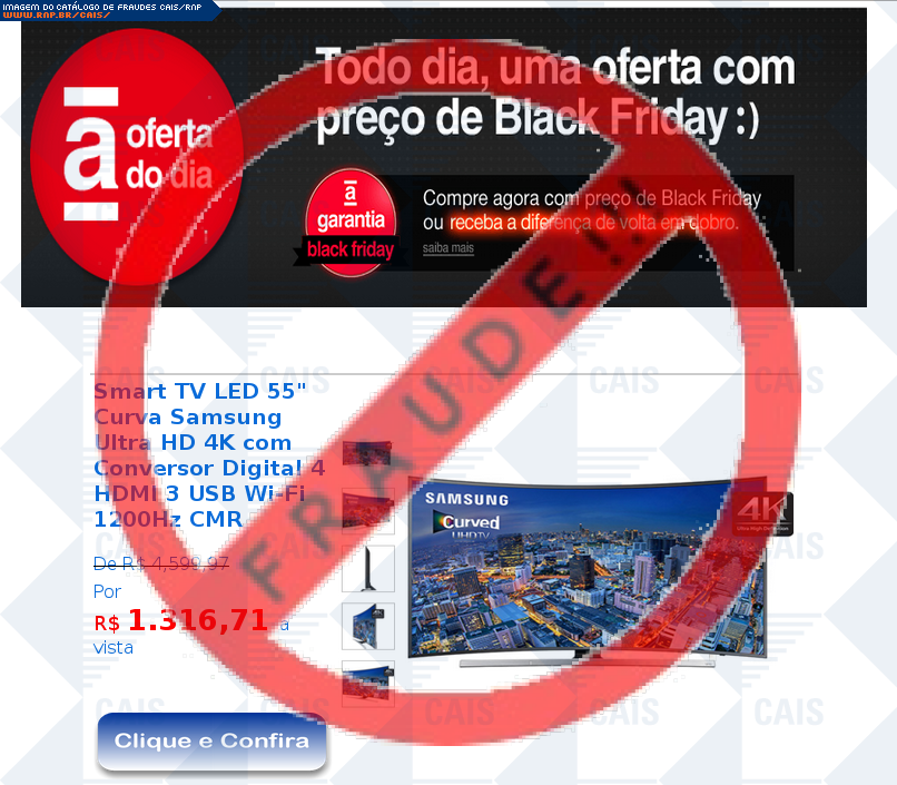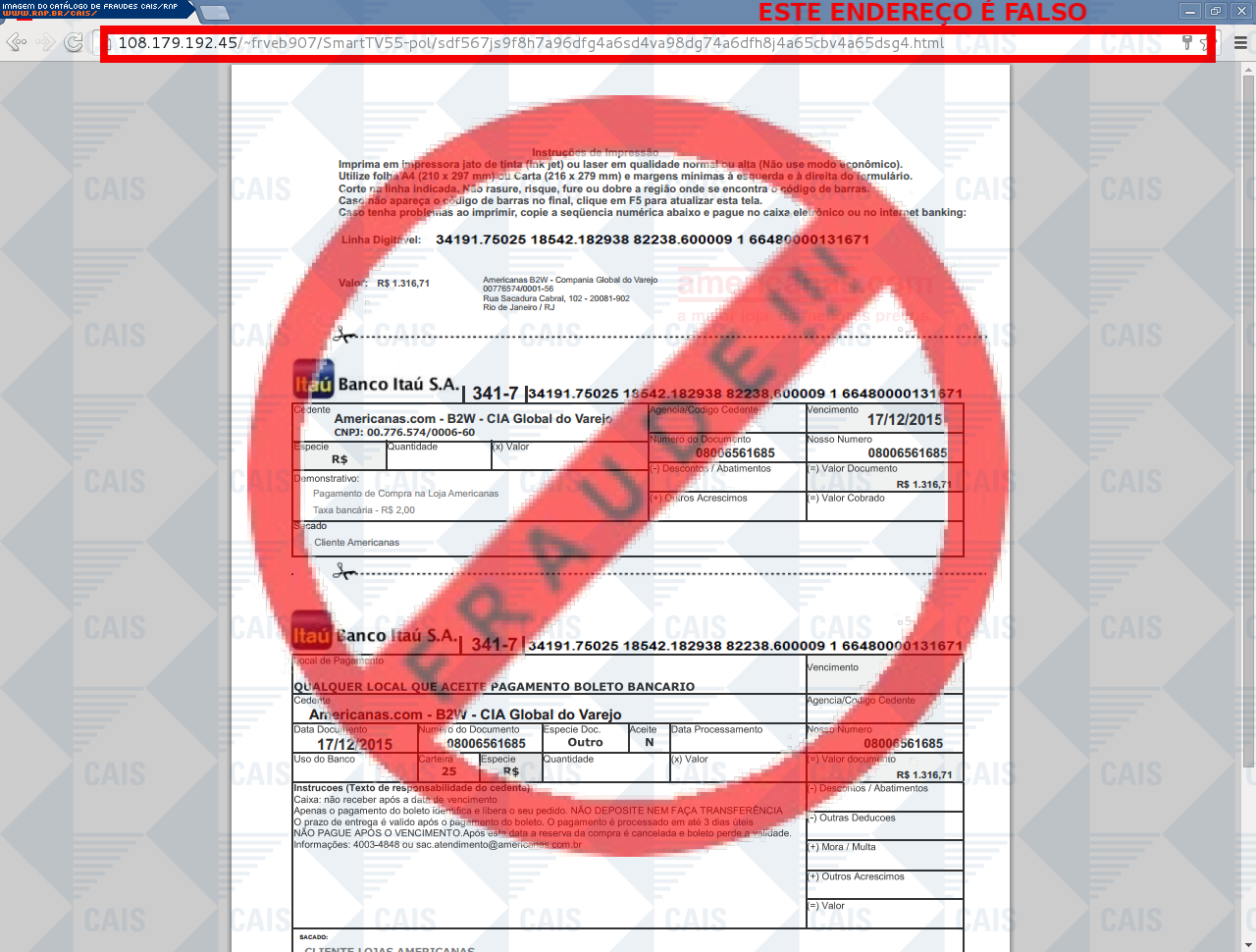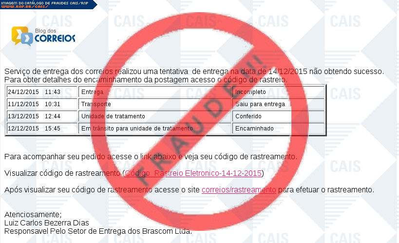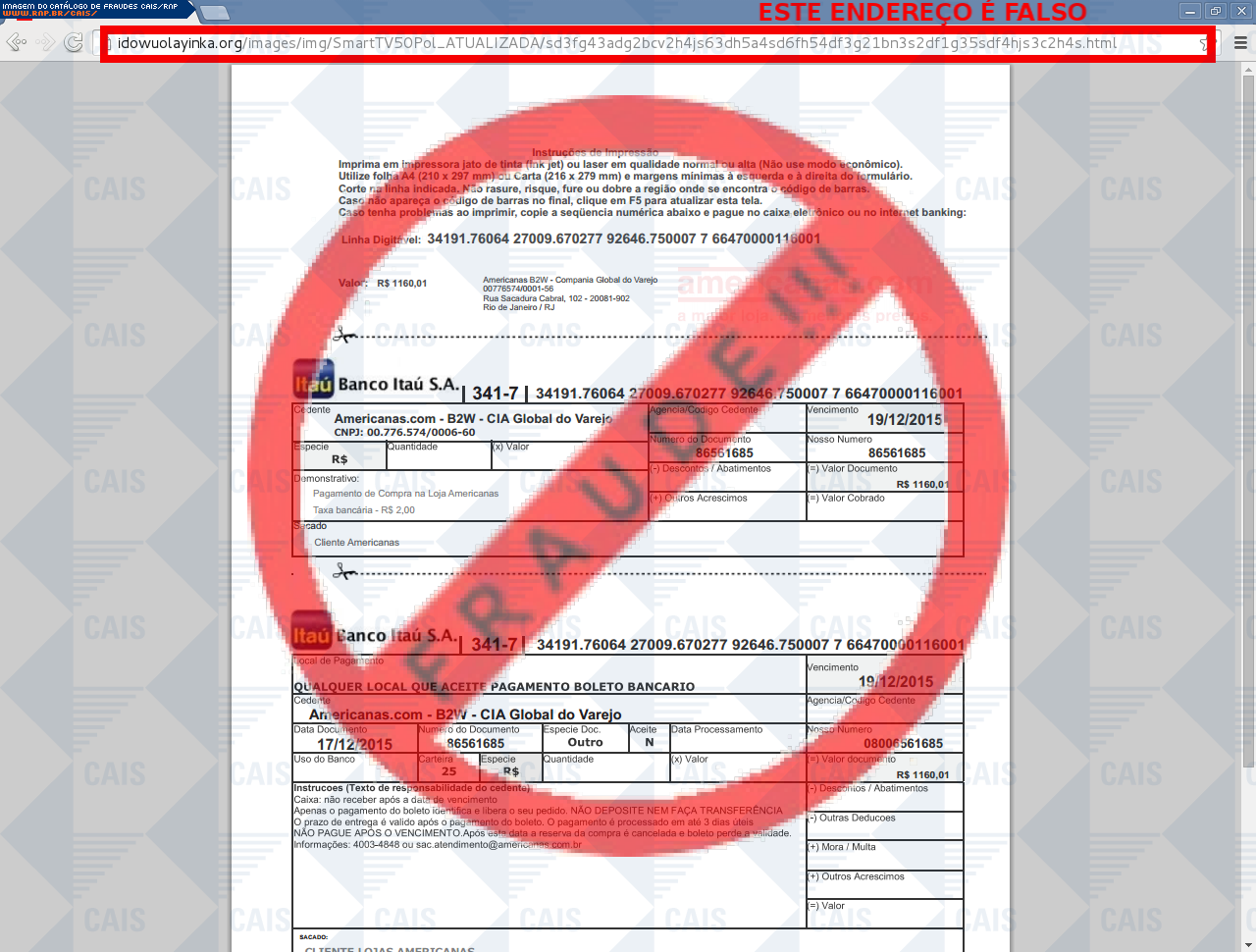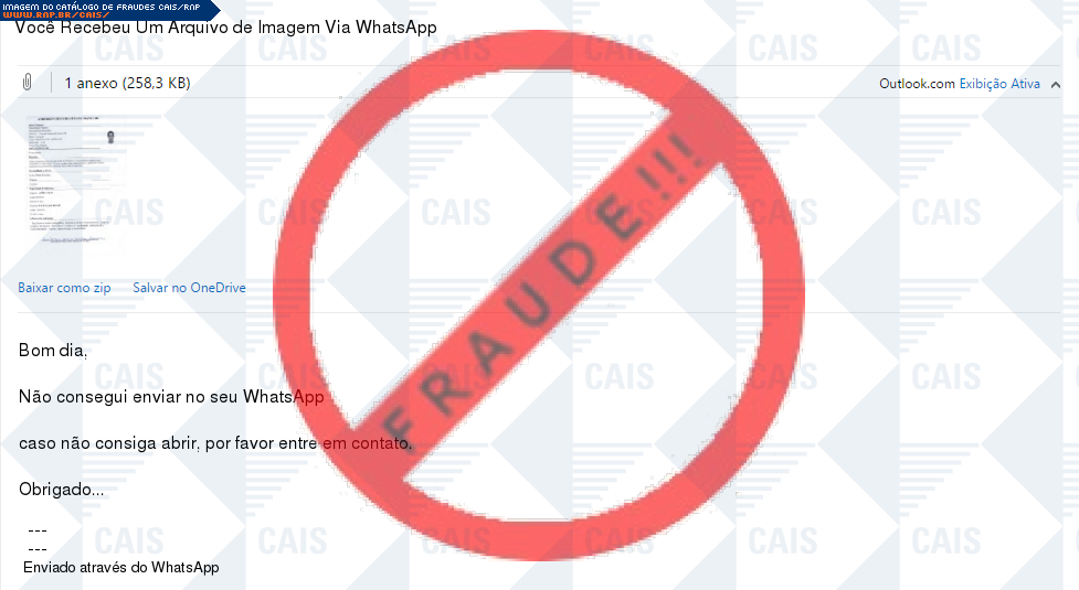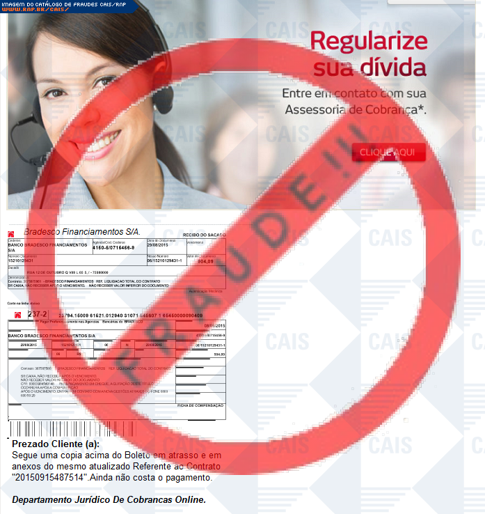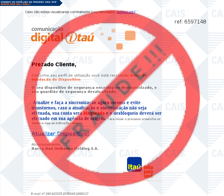 Esta página tem função informativa e educativa. Exibe uma coleção de imagens de phishing scam (fraudes eletrônicas) ou malware (código malicioso) veiculados por meio de spam (e-mail não-solicitado). Trata-se de conteúdo exemplificativo, não exaustivo, uma vez que não é possível contemplar todos os casos de fraudes existentes. Assim, caso você tenha conhecimento de um exemplar que não esteja aqui presente, isto não significa que não seja válido ou real. Inclusive incentivamos que você o envie para análise do CAIS para que, se for o caso, passe a integrar o nosso acervo.