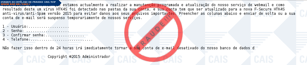| tipo | FRAUDE - Webmail atualização antivírus | ID: 45116 |