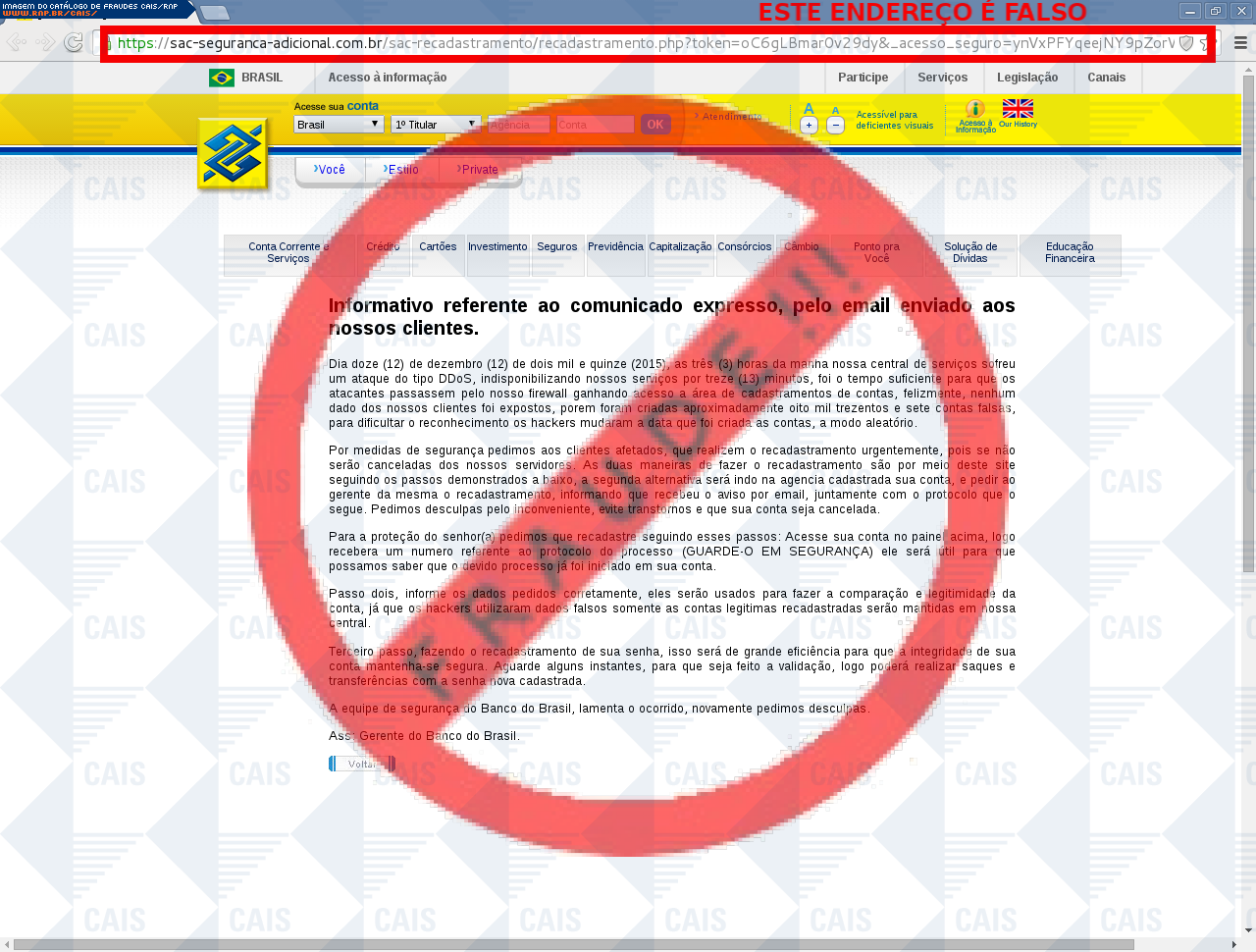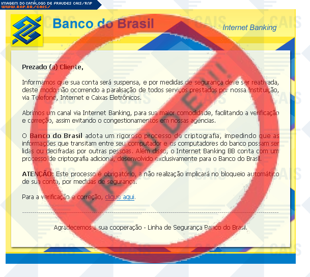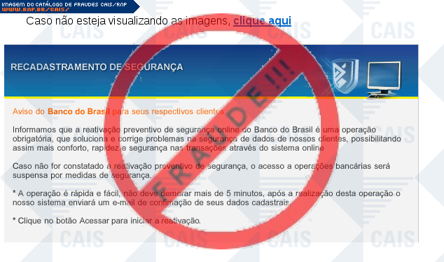 Esta página tem função informativa e educativa. Exibe uma coleção de imagens de phishing scam (fraudes eletrônicas) ou malware (código malicioso) veiculados por meio de spam (e-mail não-solicitado). Trata-se de conteúdo exemplificativo, não exaustivo, uma vez que não é possível contemplar todos os casos de fraudes existentes. Assim, caso você tenha conhecimento de um exemplar que não esteja aqui presente, isto não significa que não seja válido ou real. Inclusive incentivamos que você o envie para análise do CAIS para que, se for o caso, passe a integrar o nosso acervo.