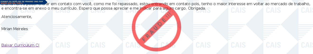 | comentário | A vítima recebe um email com um link para um suposto curriculum para download junto com um pedido de emprego. Entretanto, o link na mensgaem leva ao download de um malware de nome JS/Nemucod.ju. | |