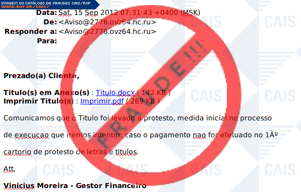 | comentário | Nessa fraude ocorre a tentativa de infectar o usuario atraves de arquivo malicioso, simulando uma cobrança de pagamento em cartorio. O email traz uma solicitação de pagamento de cobrança que não foi aceita pela instituição e traz um link para impressão do... (leia mais) | |