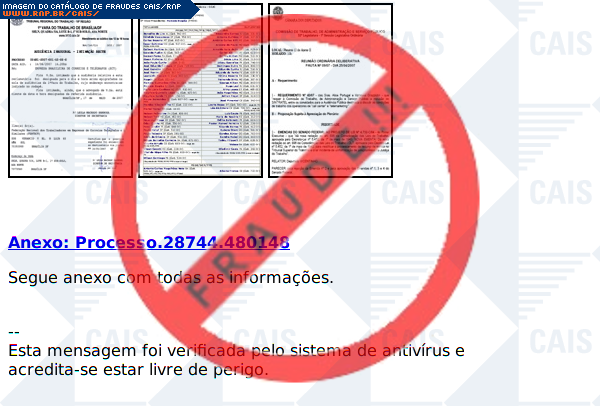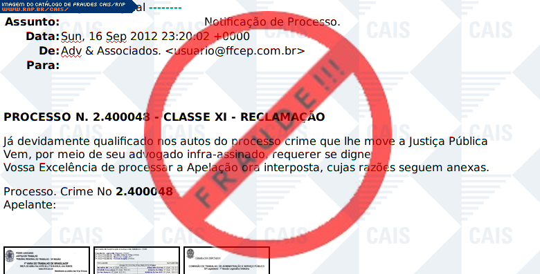 | comentário | Essa fraude simula que o usuario esteja com processo judicial e disponibiliza link para regularização. Ao clicar no link indicado o usuario faz download de um malware de danos desconhecidos. | |