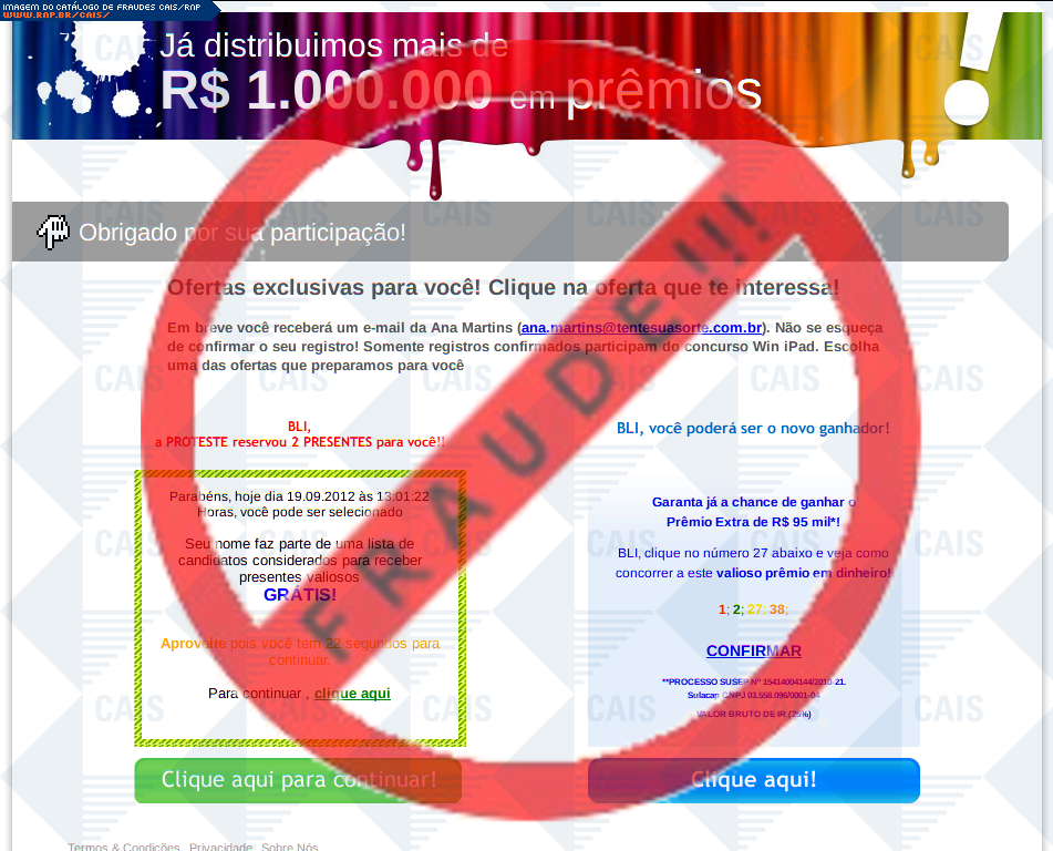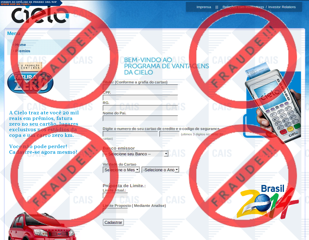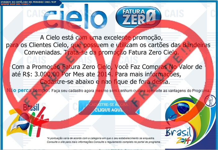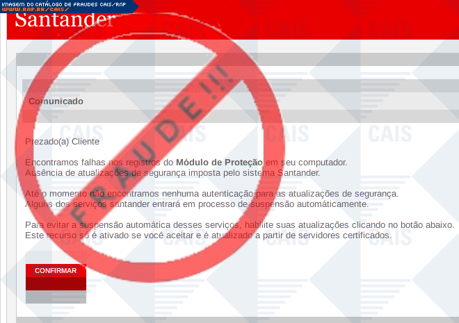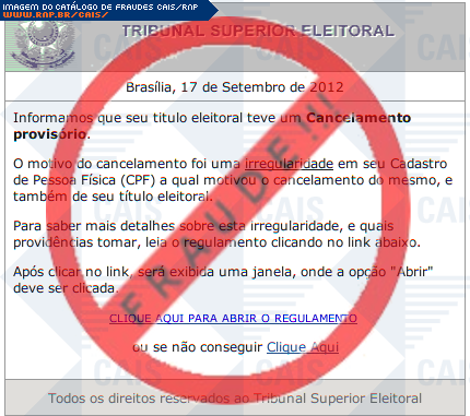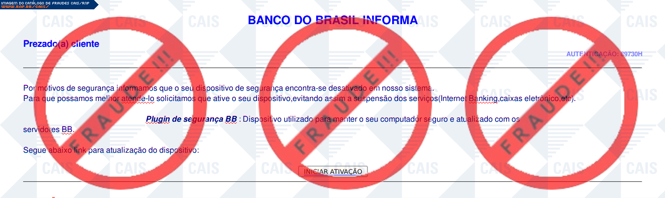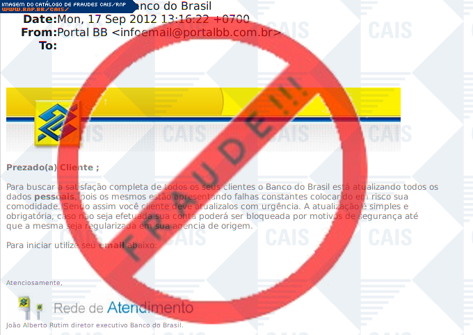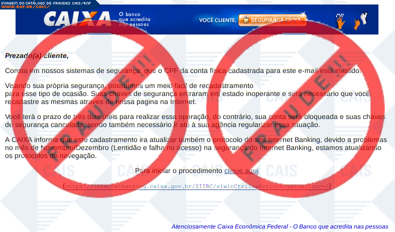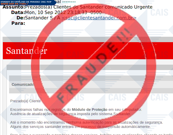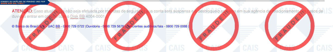 Esta página tem função informativa e educativa. Exibe uma coleção de imagens de phishing scam (fraudes eletrônicas) ou malware (código malicioso) veiculados por meio de spam (e-mail não-solicitado). Trata-se de conteúdo exemplificativo, não exaustivo, uma vez que não é possível contemplar todos os casos de fraudes existentes. Assim, caso você tenha conhecimento de um exemplar que não esteja aqui presente, isto não significa que não seja válido ou real. Inclusive incentivamos que você o envie para análise do CAIS para que, se for o caso, passe a integrar o nosso acervo.