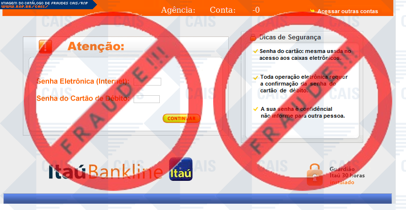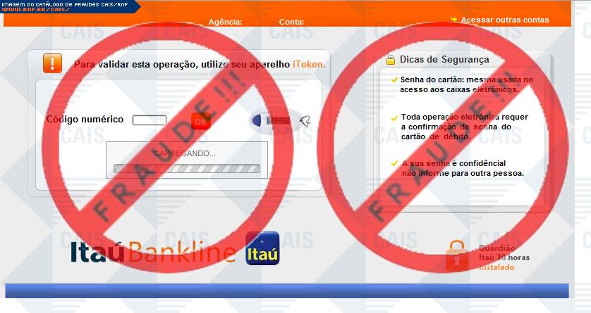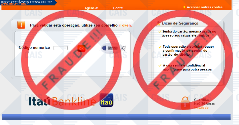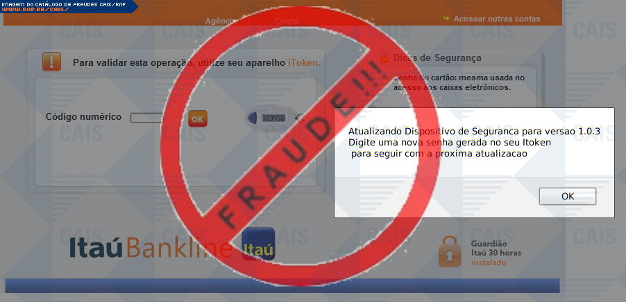 | comentário | Essa fraude simula a necessidade de atualização de um dispositivo segurança de um determinado banco, mas ao clicar no link o usuario é direcionado a uma pagina falsa. O fraudador utiliza copias de paginas semelhantes a pagina da instituição bancaria. É possivel... (leia mais) | |