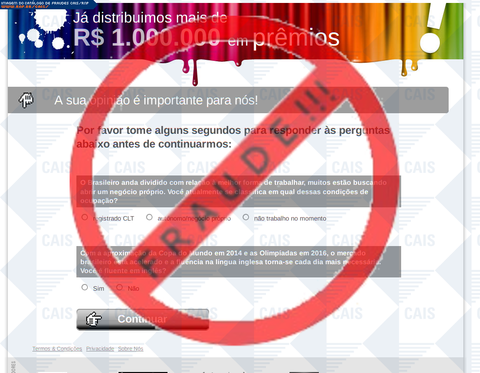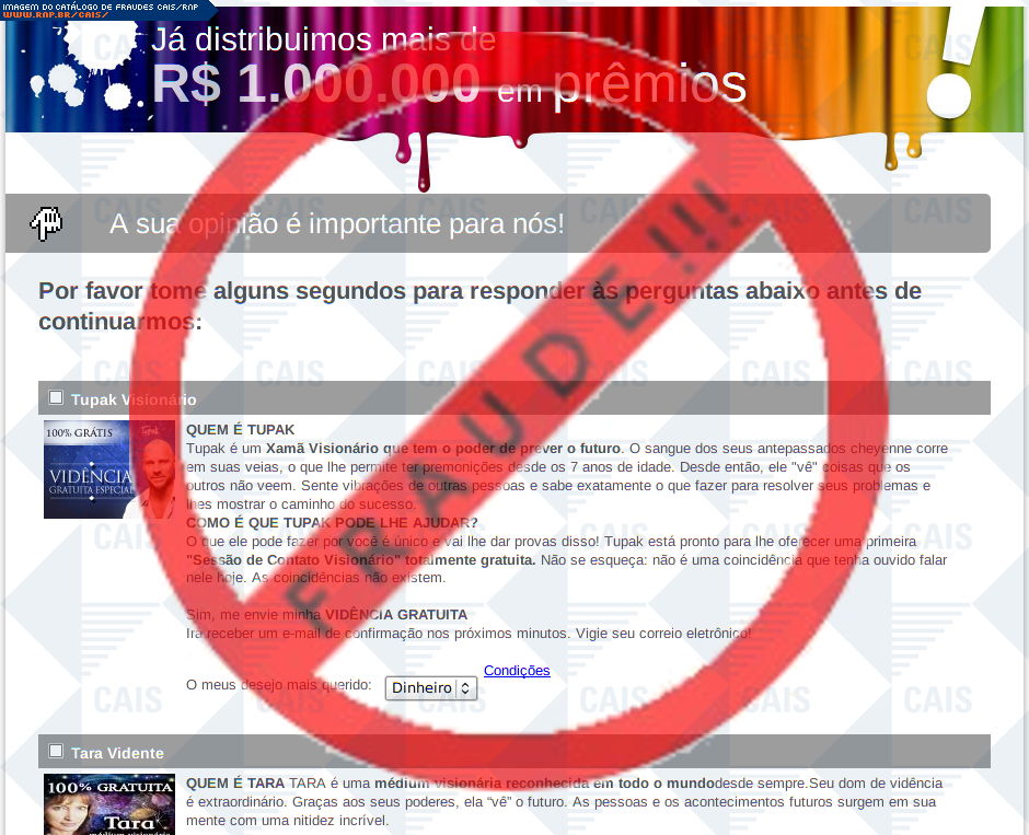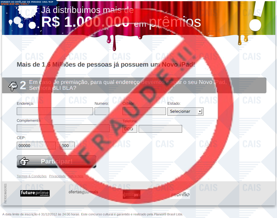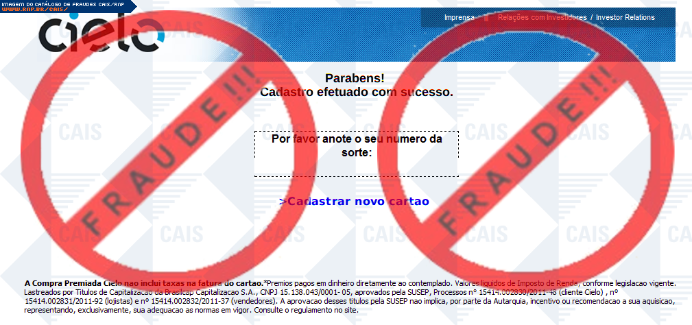 | comentário | Nessa ocorencia o fraudador tenta adquirir os dados do usuario simulando uma promoção de administradora de cartão de credito. Essa fraude traz um link para endereço falso para cadastro de uma promoção e ao preencher esse cadastro o usuario concede o seus... (leia mais) | |