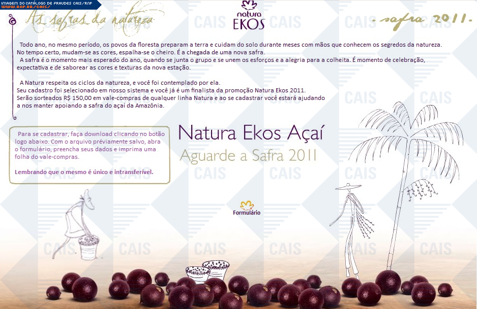 | comentário | A mensagem, em nome da Natura, informa que a vítima foi selecionada para participar da promoção Natura Ekos 2011. O link para o cadastro na promoção leva ao arquivo malicioso que foi identificado como Gen:Trojan.Heur.vqW@rvrZ26gOD (BitDefender). | |
