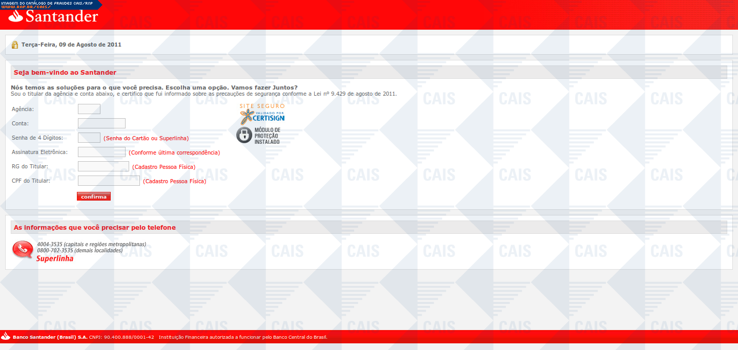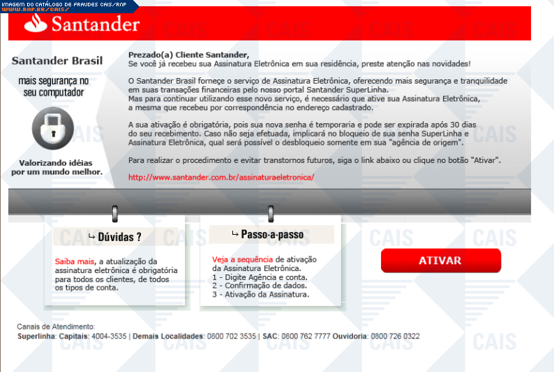 Esta página tem função informativa e educativa. Exibe uma coleção de imagens de phishing scam (fraudes eletrônicas) ou malware (código malicioso) veiculados por meio de spam (e-mail não-solicitado). Trata-se de conteúdo exemplificativo, não exaustivo, uma vez que não é possível contemplar todos os casos de fraudes existentes. Assim, caso você tenha conhecimento de um exemplar que não esteja aqui presente, isto não significa que não seja válido ou real. Inclusive incentivamos que você o envie para análise do CAIS para que, se for o caso, passe a integrar o nosso acervo.