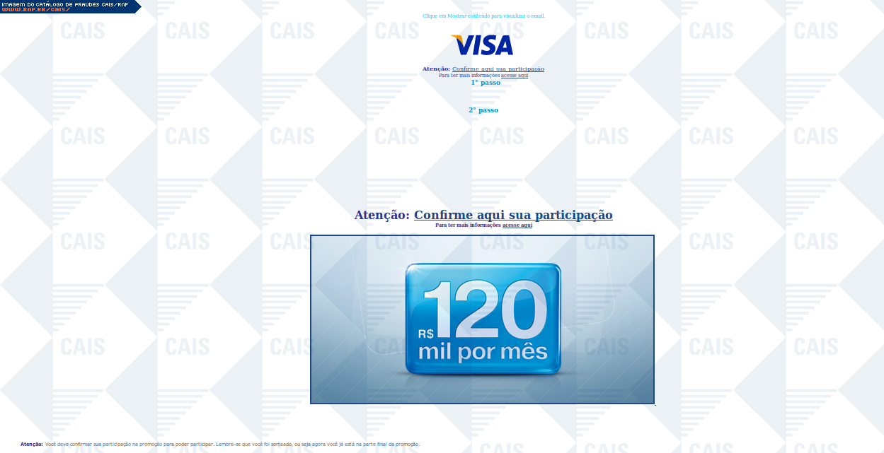 | comentário | A mensagem informa que a vítima foi selecionada para participar de uma promoção da Visa. O link para o cadastro na promoção leva a conteúdo malicioso que já havia sido removido no momento da análise. | |