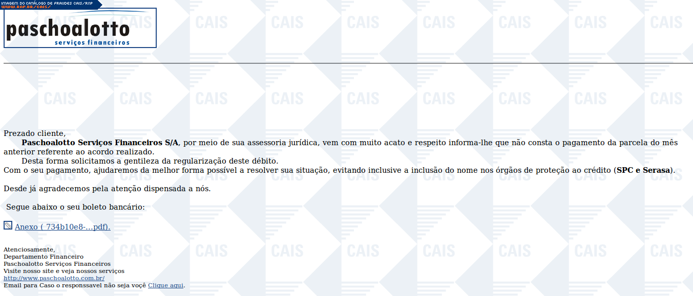 | comentário | A fraude se passa pela cobrança de uma dívida pela empresa Paschoalotto Serviços Financeiros S/A. O link para o suposto boleto leva a conteúdo malicioso que não estava disponível no momento da análise. | |