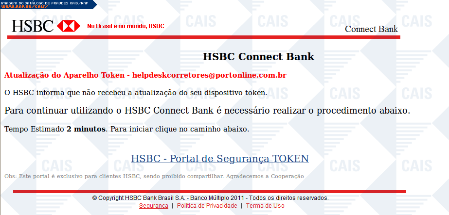 | comentário | A mensagem, em nome do banco HSBC, contém um link para a atualização do Token. O conteúdo malicioso não estava disponível no momento da análise. | |