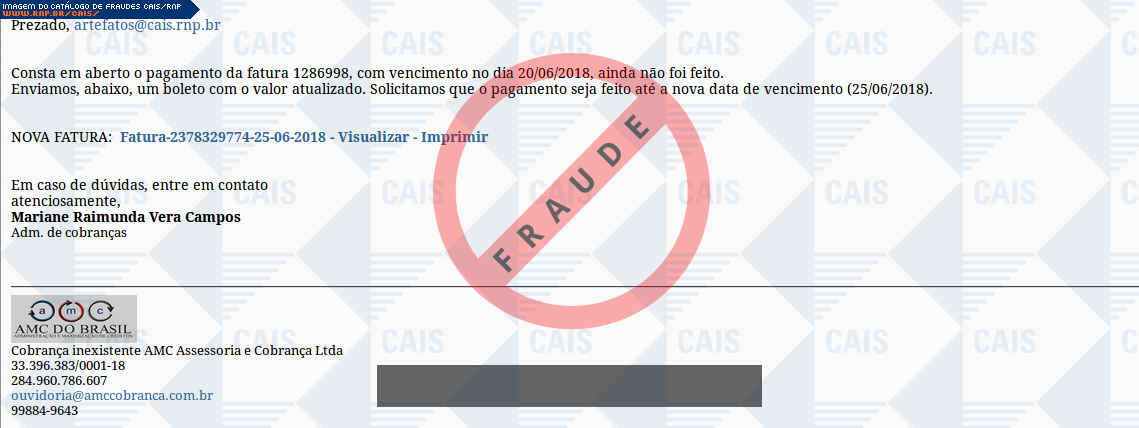 Esta página tem função informativa e educativa. Exibe uma coleção de imagens de phishing scam (fraudes eletrônicas) ou malware (código malicioso) veiculados por meio de spam (e-mail não-solicitado). Trata-se de conteúdo exemplificativo, não exaustivo, uma vez que não é possível contemplar todos os casos de fraudes existentes. Assim, caso você tenha conhecimento de um exemplar que não esteja aqui presente, isto não significa que não seja válido ou real. Inclusive incentivamos que você o envie para análise do CAIS para que, se for o caso, passe a integrar o nosso acervo.