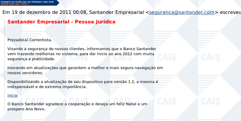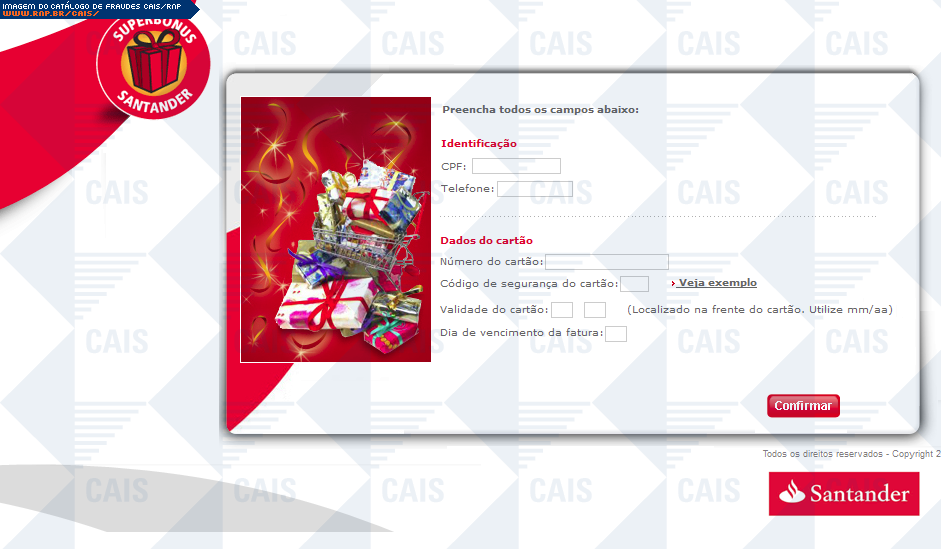 Esta página tem função informativa e educativa. Exibe uma coleção de imagens de phishing scam (fraudes eletrônicas) ou malware (código malicioso) veiculados por meio de spam (e-mail não-solicitado). Trata-se de conteúdo exemplificativo, não exaustivo, uma vez que não é possível contemplar todos os casos de fraudes existentes. Assim, caso você tenha conhecimento de um exemplar que não esteja aqui presente, isto não significa que não seja válido ou real. Inclusive incentivamos que você o envie para análise do CAIS para que, se for o caso, passe a integrar o nosso acervo.