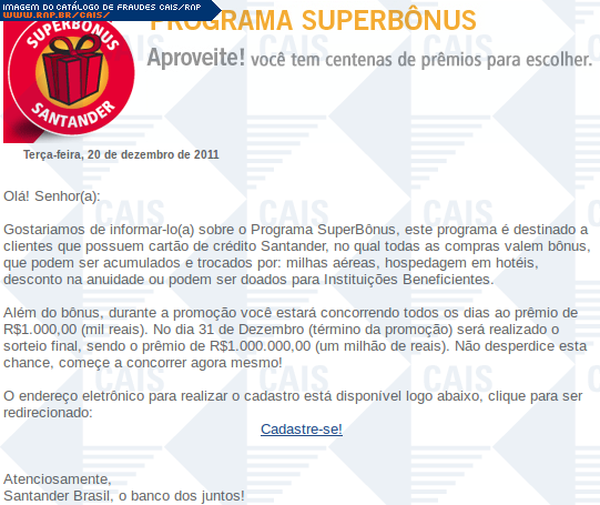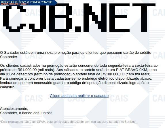 | comentário | Falsa mensagem em nome do Santander oferece cadastro em promoção. Contudo o link para tal cadastro aponta para uma falsa página do banco, na qual dados sigilosos são solicitados. | |