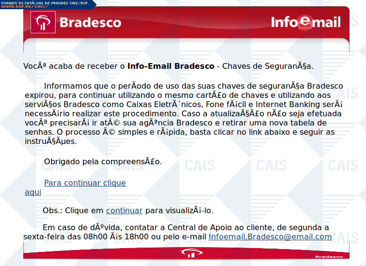 | comentário | Falso e-mail em nome do Banco Bradesco informa que a chave de segurança expirou. Oferece um link para que a vítima continue a usar os serviços do Bradesco. Contudo, tal link não apontava para uma página válida, no momento da análise. | |