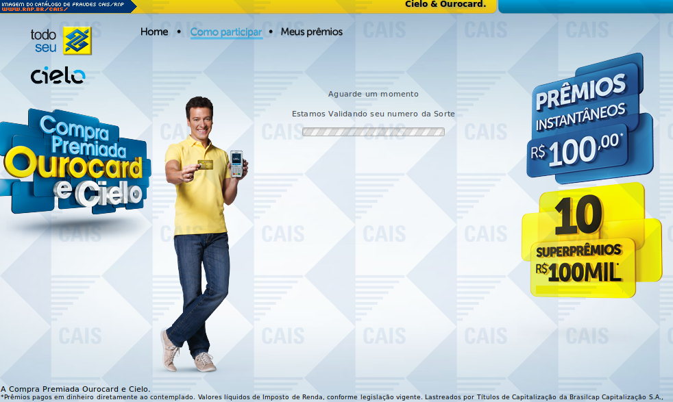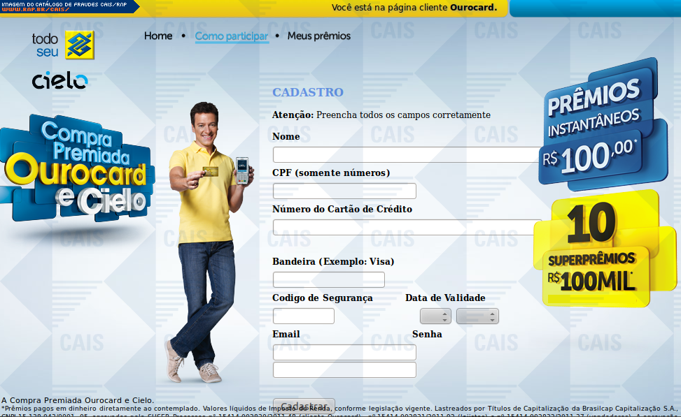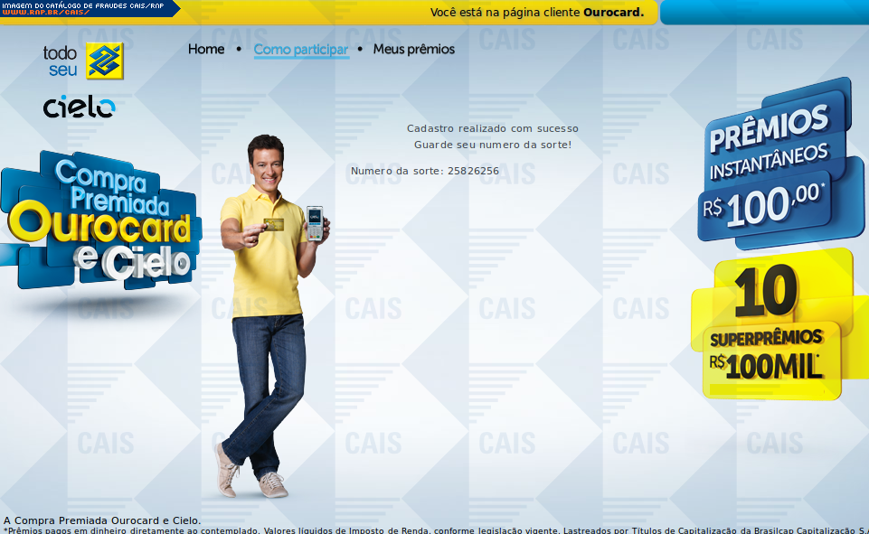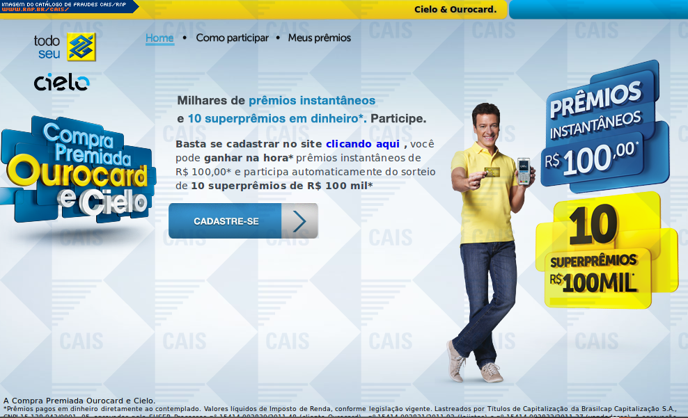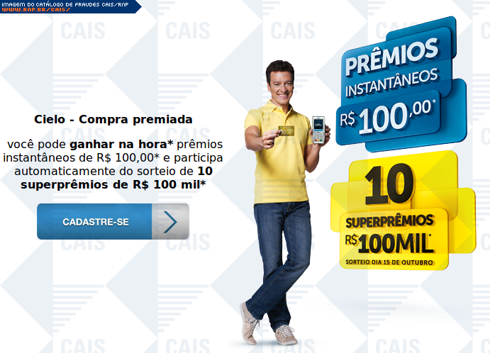 | comentário | Falsa mensagem em nome da CIELO oferece cadastro em promoção. O link para tal cadastro aponta para uma falsa página da cielo, na qual dados sigilosos são solicitados. | |
