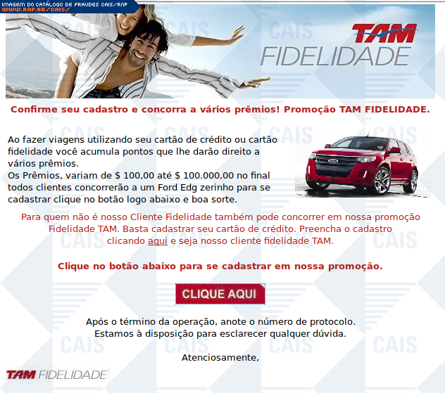 | comentário | Falsa promoção em nome da TAM oferece carro e prêmios em dinheiro. Há um link para cadastro em tal promoção, porém este não estava ativo no momento da análise. | |