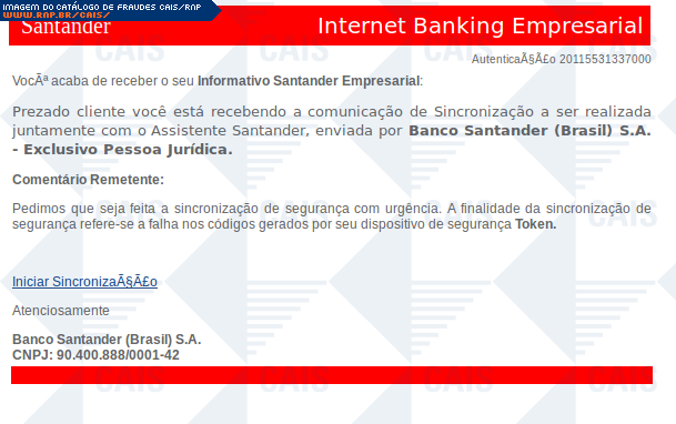 | comentário | A fraude se trata de um falso alerta sobre a necessidade de uma sicronização de segurança no dispositivo token. Havia um link para iniciar tal sincronização, porém este não apontava para uma página válida, no momento da análise. | |