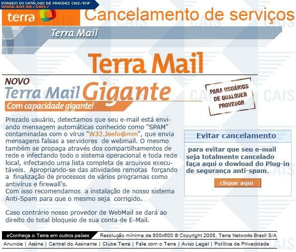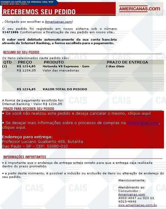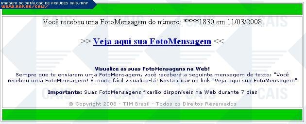 Esta página tem função informativa e educativa. Exibe uma coleção de imagens de phishing scam (fraudes eletrônicas) ou malware (código malicioso) veiculados por meio de spam (e-mail não-solicitado). Trata-se de conteúdo exemplificativo, não exaustivo, uma vez que não é possível contemplar todos os casos de fraudes existentes. Assim, caso você tenha conhecimento de um exemplar que não esteja aqui presente, isto não significa que não seja válido ou real. Inclusive incentivamos que você o envie para análise do CAIS para que, se for o caso, passe a integrar o nosso acervo.