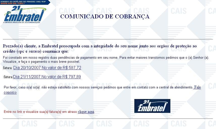 | comentário | Esta fraude avisa o usuário de que ele possui debitos com a Embratel e que para providenciar o pagamento deve-se acessar as faturas on-line. Ao clicar nos links o usuário é direcionado para um arquivo malicioso, no caso, embratel.cmd | |