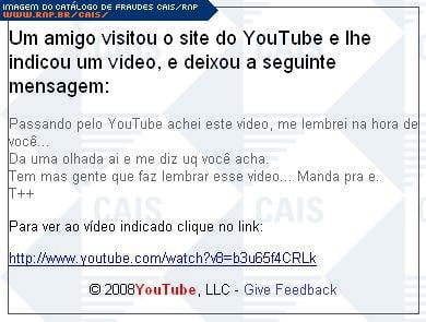 | comentário | Fraude envolvendo o site YouTube, observe que no assunto da mensagem o nome do site está grafado erroneamente, o que deve ter sido realizado para enganar filtros antispam e deixar a mensagem passar. Novamente temos um caso de fraude com página dupla, ao acessar... (leia mais) | |