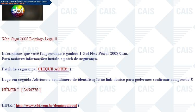 | comentário | Fraude envolvendo o programa do Gugu. O ganhador do carro necessita instalar um patch de segurança. A montagem da fraude é fraca e não faz muito sentido o pedido com o prêmio oferecido. | |