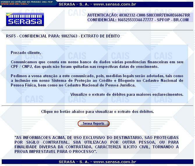 | comentário | Um exemplo clássico de fraude que utiliza o nome da Serasa informando que existem pendências financeiras em nome do usuário e que este precisa visualizar o extrato de débitos. O bom senso diria que a Serasa não teria condições de disponibilizar "arquivos"... (leia mais) | |