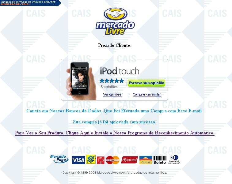 | comentário | Fraude envolvendo o site de leilão Mercado Livre, que indica ao usuário a existência de uma compra efetuada. Neste caso basta lembrar que as compras realizadas no Mercado Livre são notificadas por e-mail pelo vendedor e nao pelo "Mercado Livre" como o fraude... (leia mais) | |