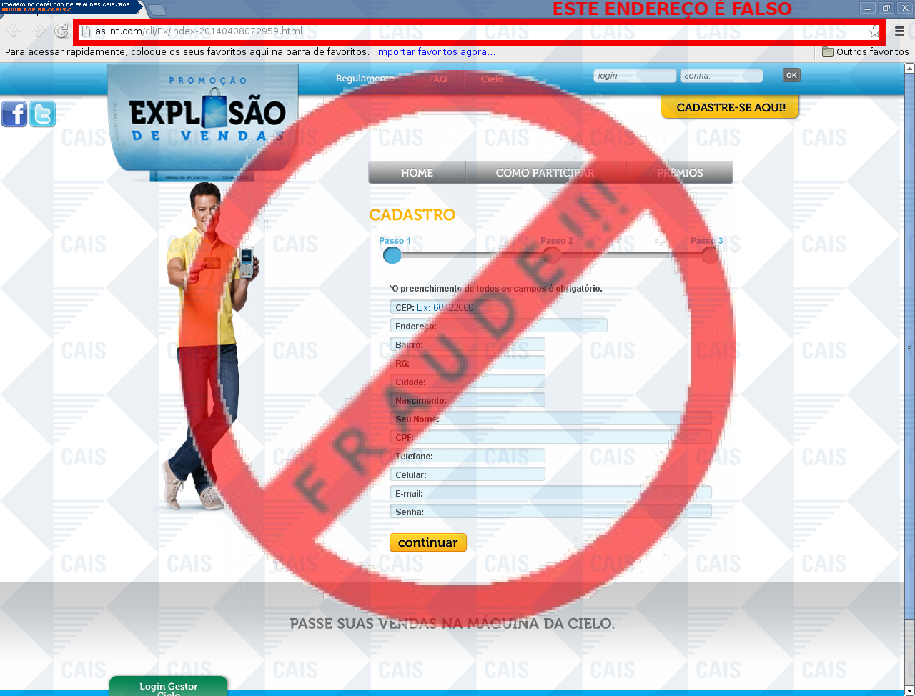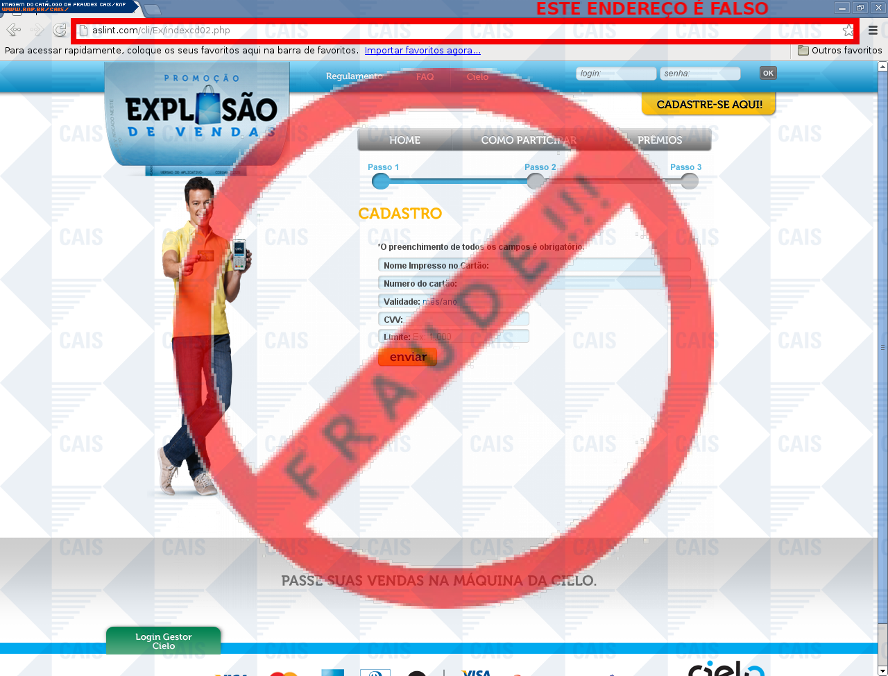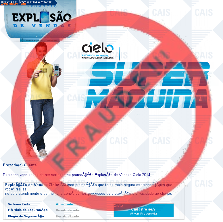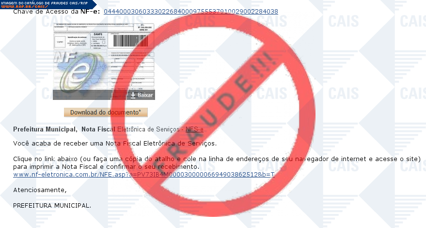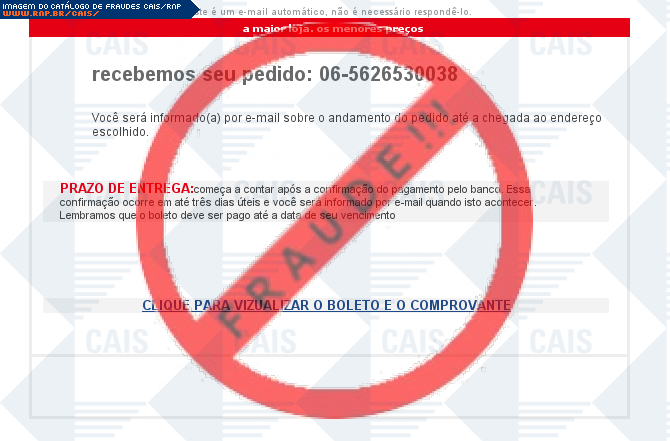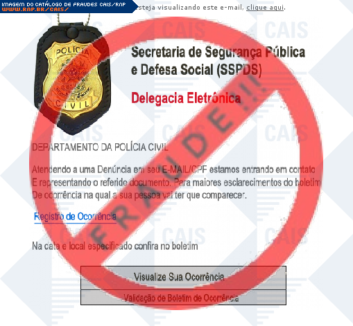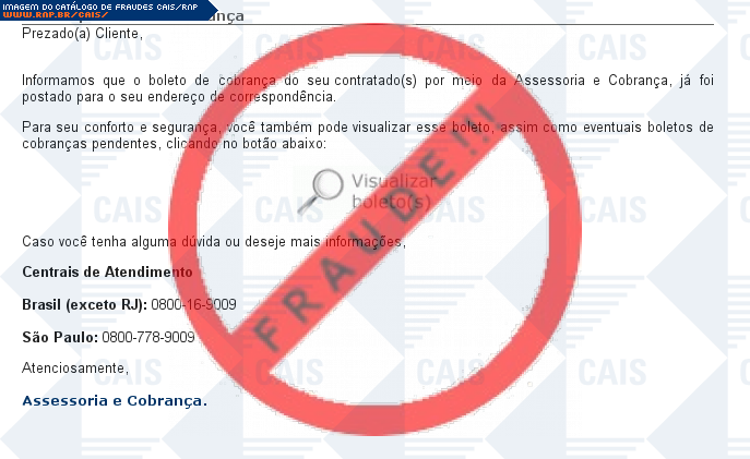 Esta página tem função informativa e educativa. Exibe uma coleção de imagens de phishing scam (fraudes eletrônicas) ou malware (código malicioso) veiculados por meio de spam (e-mail não-solicitado). Trata-se de conteúdo exemplificativo, não exaustivo, uma vez que não é possível contemplar todos os casos de fraudes existentes. Assim, caso você tenha conhecimento de um exemplar que não esteja aqui presente, isto não significa que não seja válido ou real. Inclusive incentivamos que você o envie para análise do CAIS para que, se for o caso, passe a integrar o nosso acervo.
