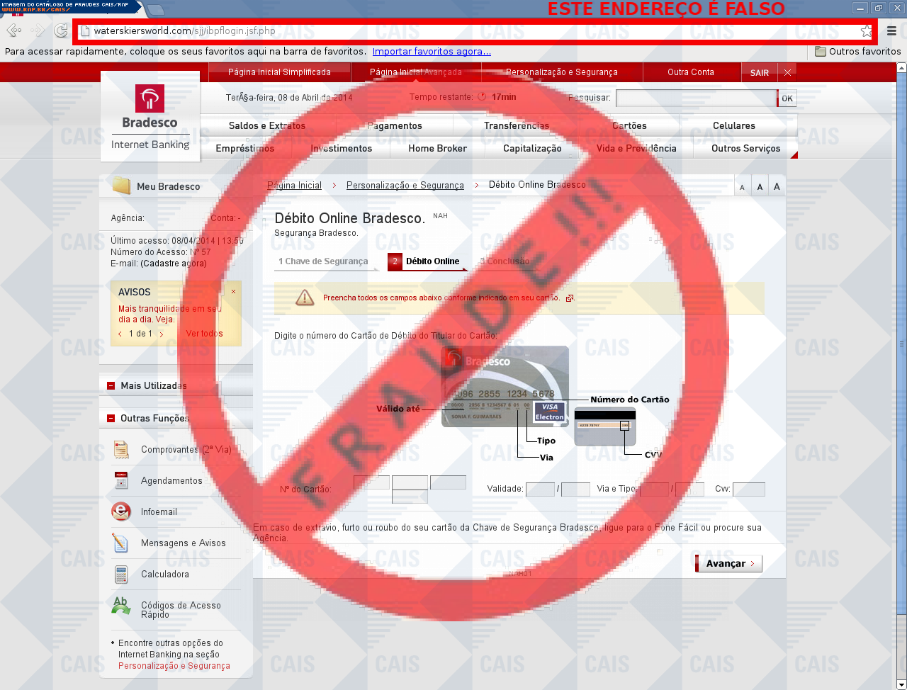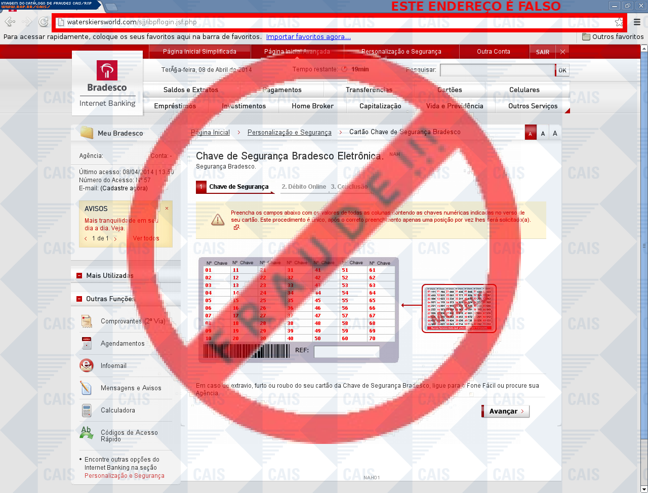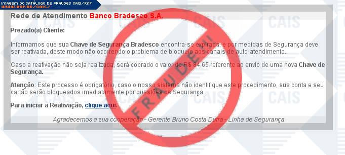 | comentário | A vítima recebe uma mensagem, informando que sua chave de segurança encontra-se expirada, mas ao clicar no link para realizar a ativação, a vítima é direcionada para uma página falsa, que é muito semelhante a página original. | |