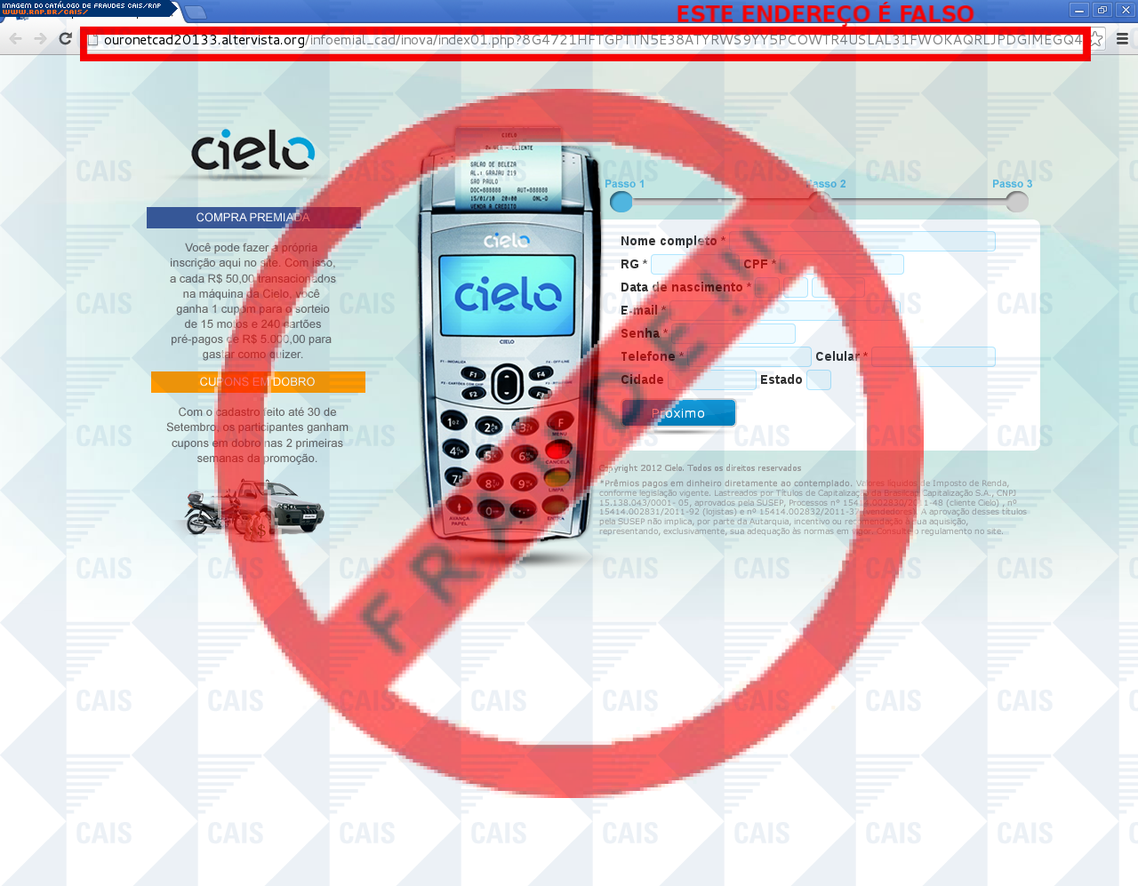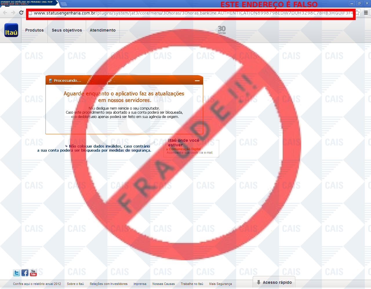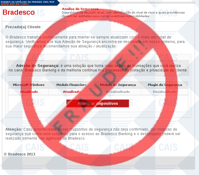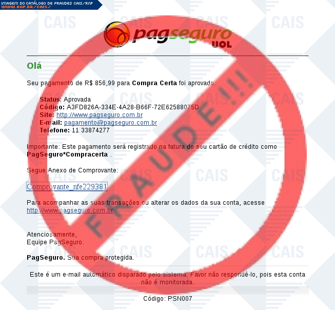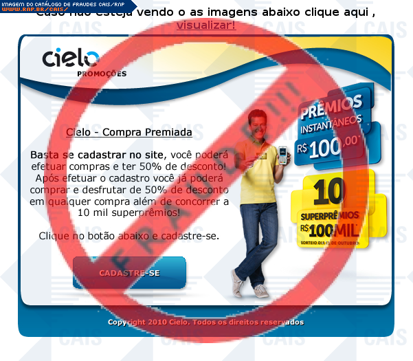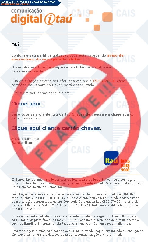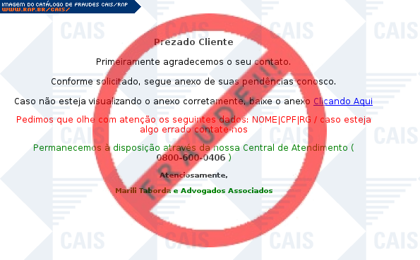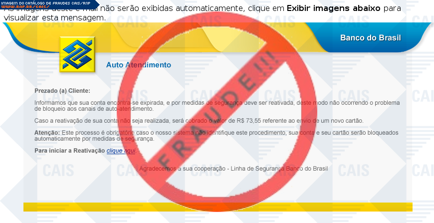 Esta página tem função informativa e educativa. Exibe uma coleção de imagens de phishing scam (fraudes eletrônicas) ou malware (código malicioso) veiculados por meio de spam (e-mail não-solicitado). Trata-se de conteúdo exemplificativo, não exaustivo, uma vez que não é possível contemplar todos os casos de fraudes existentes. Assim, caso você tenha conhecimento de um exemplar que não esteja aqui presente, isto não significa que não seja válido ou real. Inclusive incentivamos que você o envie para análise do CAIS para que, se for o caso, passe a integrar o nosso acervo.