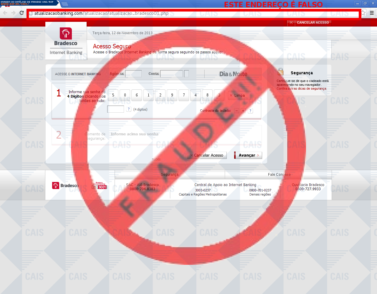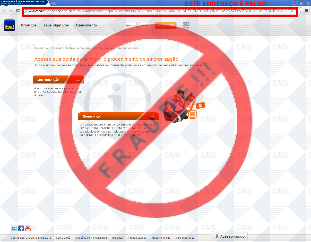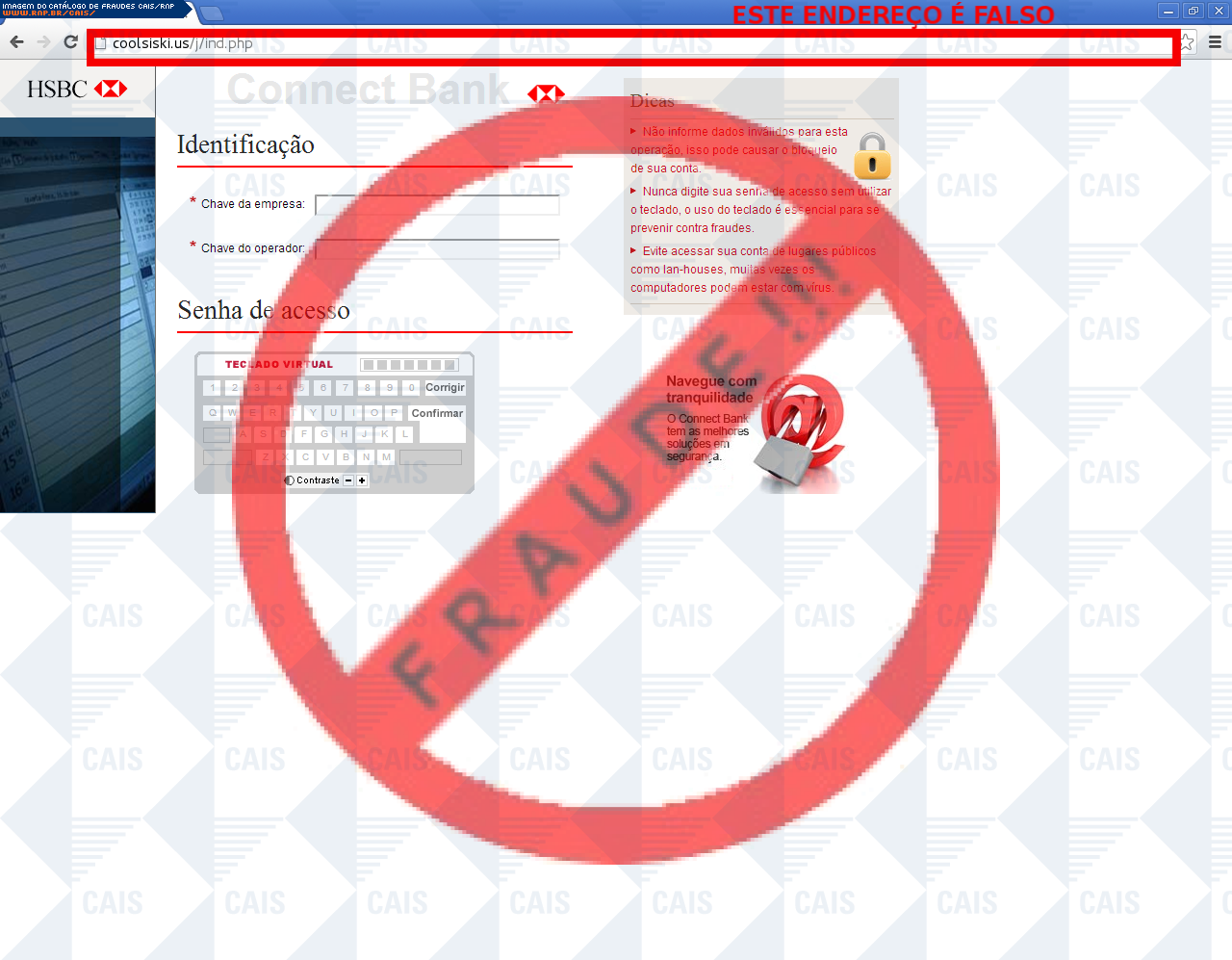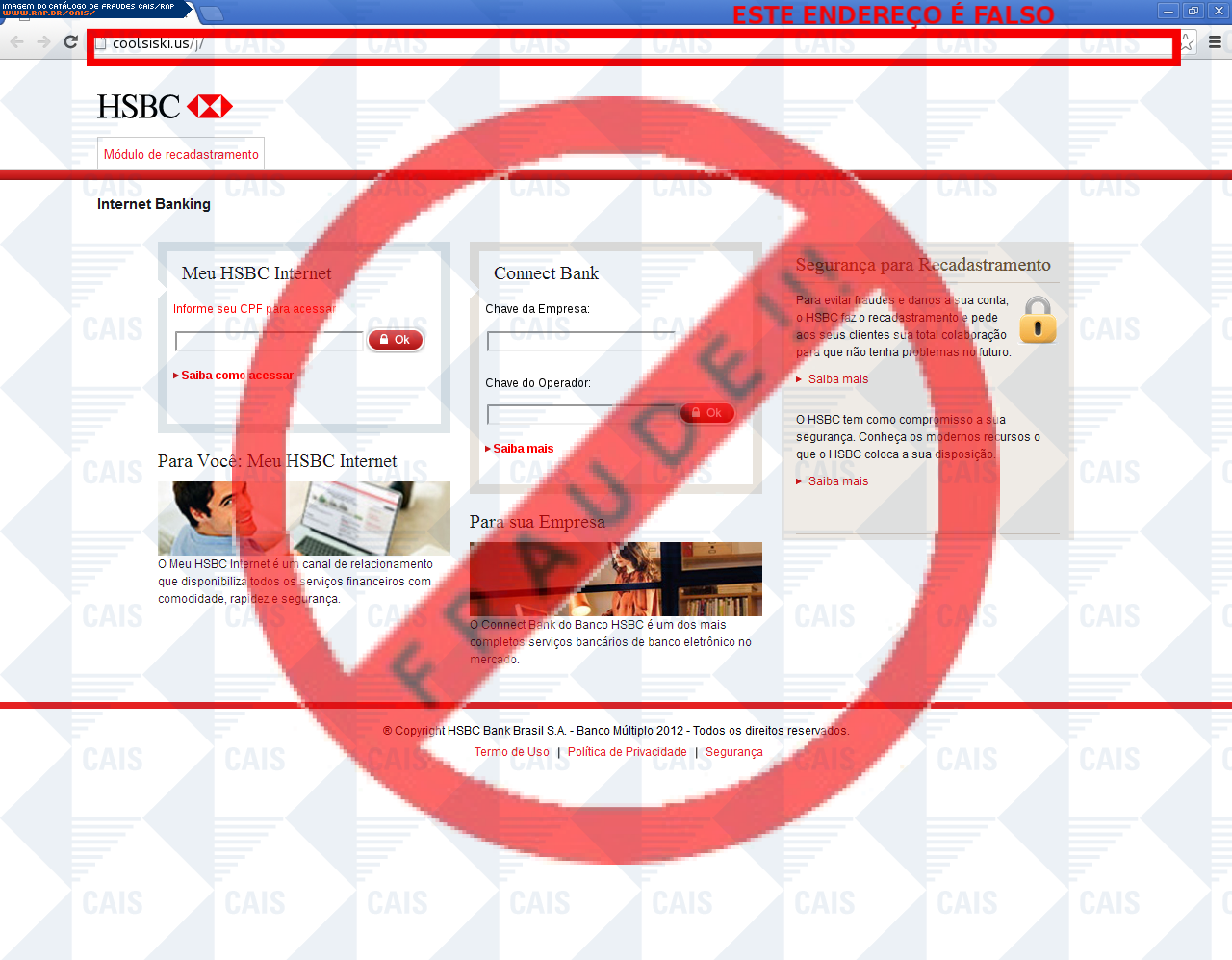 Esta página tem função informativa e educativa. Exibe uma coleção de imagens de phishing scam (fraudes eletrônicas) ou malware (código malicioso) veiculados por meio de spam (e-mail não-solicitado). Trata-se de conteúdo exemplificativo, não exaustivo, uma vez que não é possível contemplar todos os casos de fraudes existentes. Assim, caso você tenha conhecimento de um exemplar que não esteja aqui presente, isto não significa que não seja válido ou real. Inclusive incentivamos que você o envie para análise do CAIS para que, se for o caso, passe a integrar o nosso acervo.
