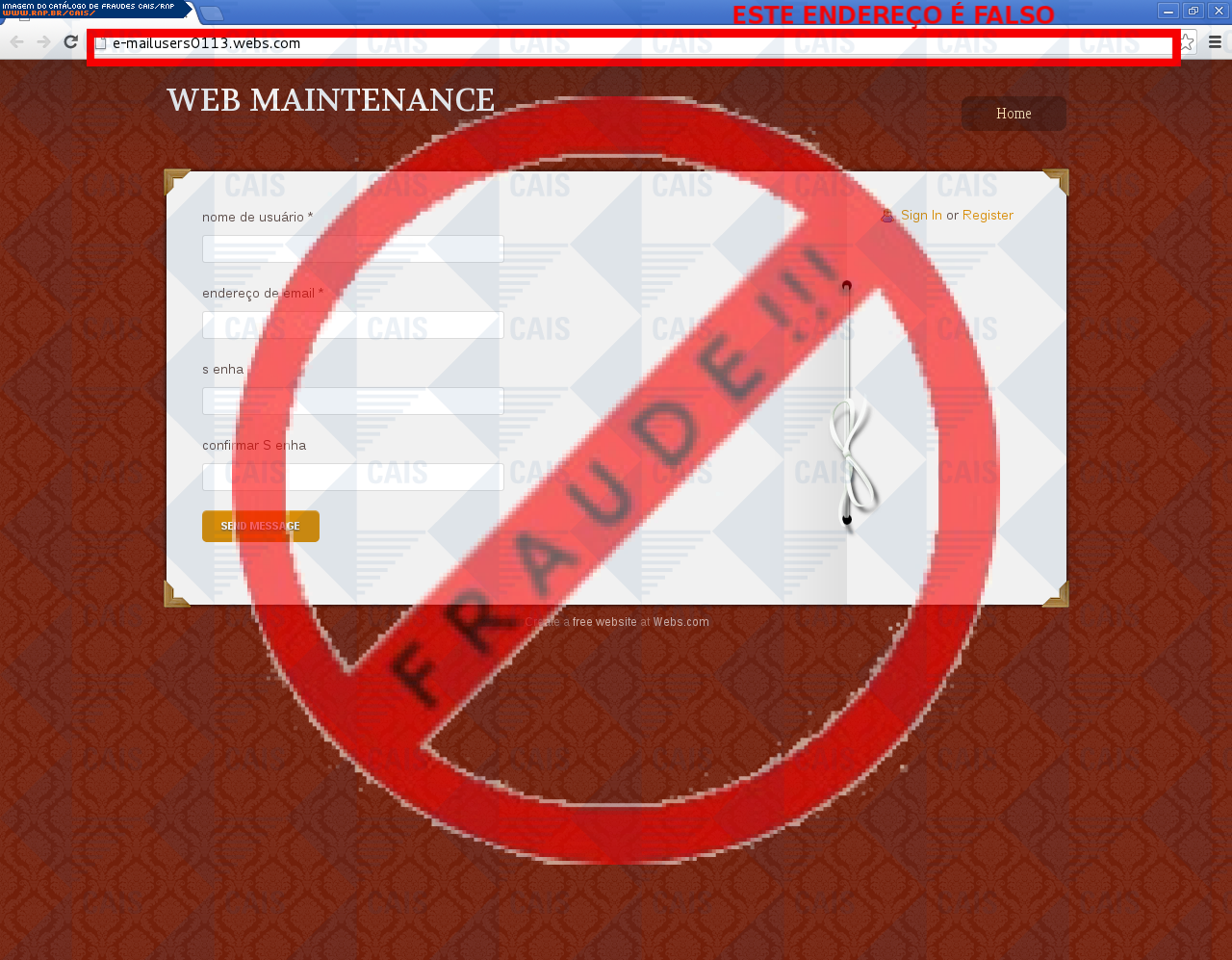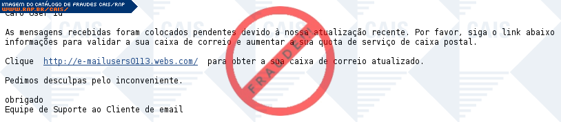 | comentário | A fraude consiste no envio de uma mensagem informando a vítima da necessidade de atualizar sua conta de email. O link para essa suposta atualização direciona para um site de phishing. | |