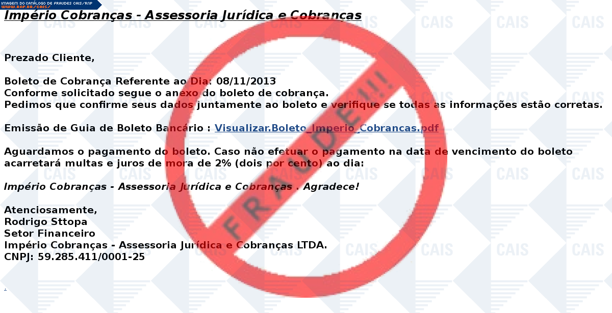 | comentário | A vítima recebe um email com um link para um suposto boleto de cobrança. O link redireciona para o download de um malware. | |