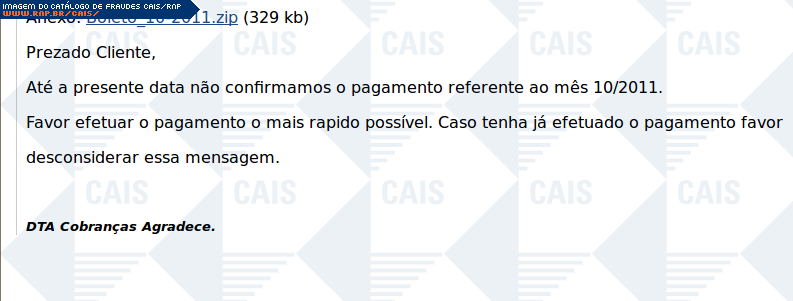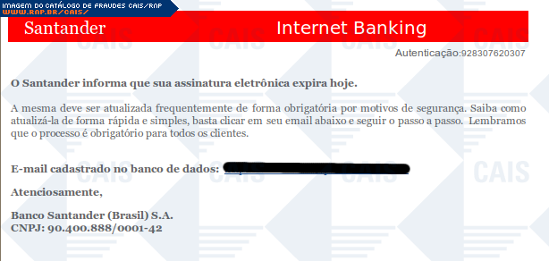 Esta página tem função informativa e educativa. Exibe uma coleção de imagens de phishing scam (fraudes eletrônicas) ou malware (código malicioso) veiculados por meio de spam (e-mail não-solicitado). Trata-se de conteúdo exemplificativo, não exaustivo, uma vez que não é possível contemplar todos os casos de fraudes existentes. Assim, caso você tenha conhecimento de um exemplar que não esteja aqui presente, isto não significa que não seja válido ou real. Inclusive incentivamos que você o envie para análise do CAIS para que, se for o caso, passe a integrar o nosso acervo.