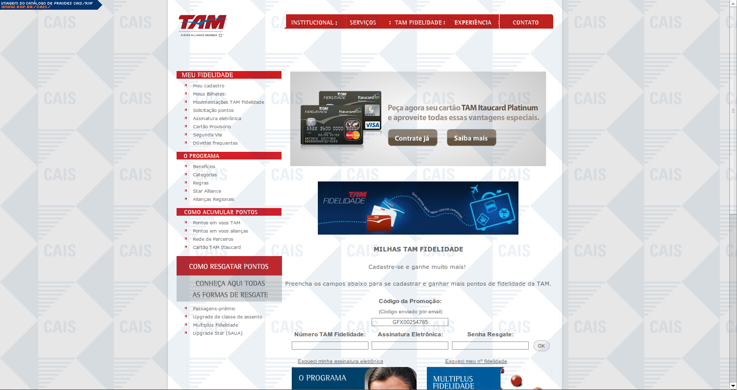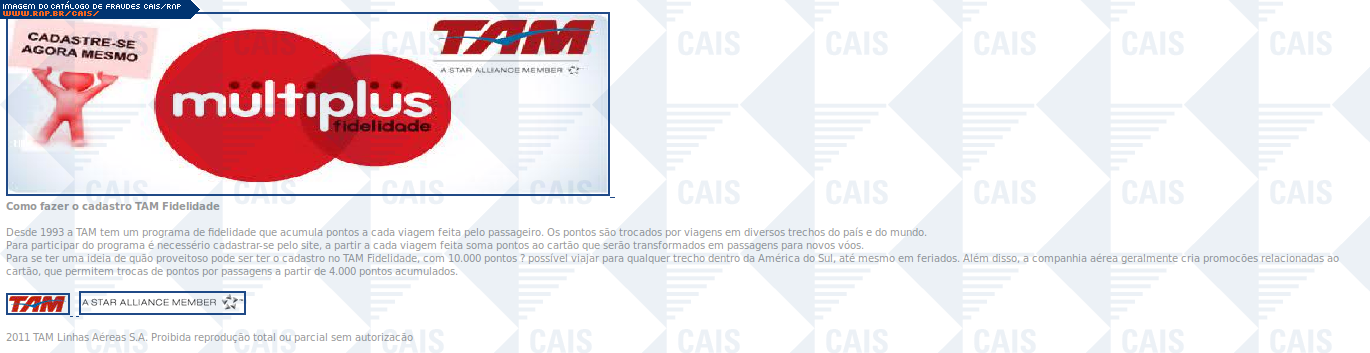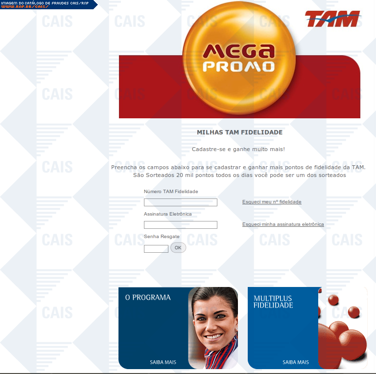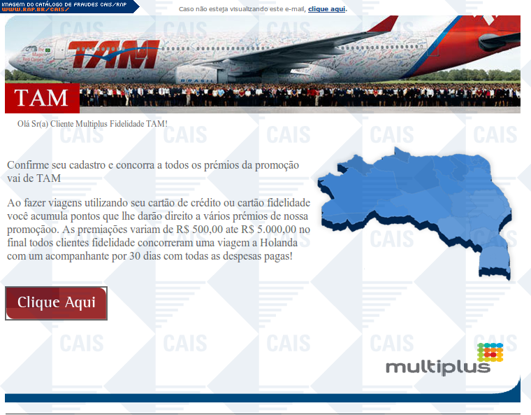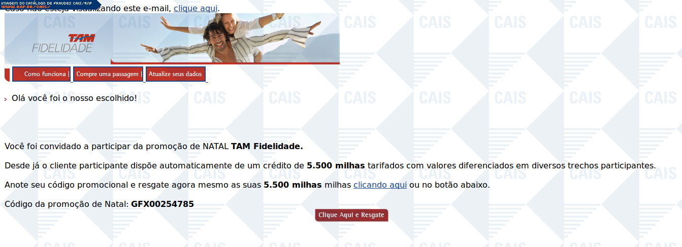 | comentário | A fraude contém um link para o cadastro na promoção Natal TAM Fidelidade. O link leva a uma página falsa destinada a coletar dados pessoais da vitima. | |