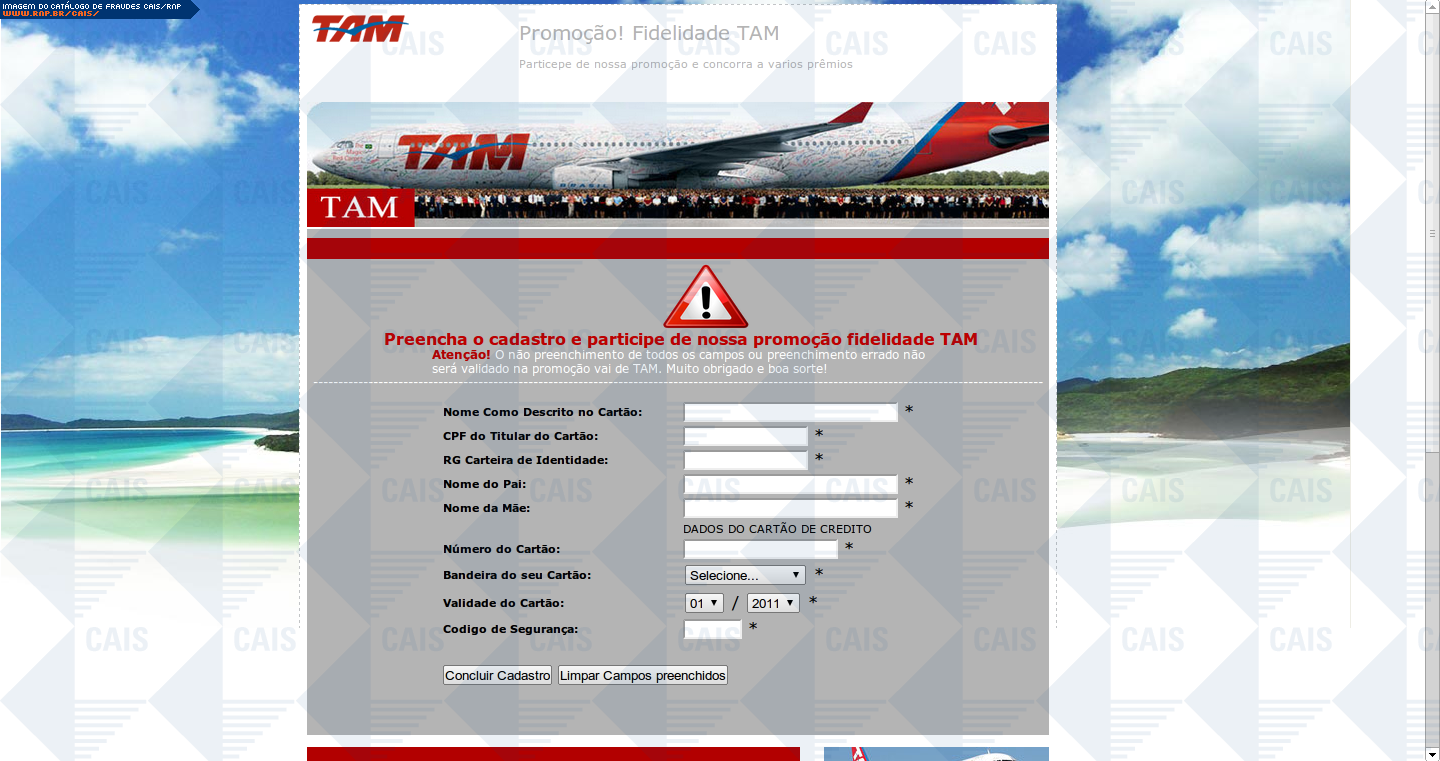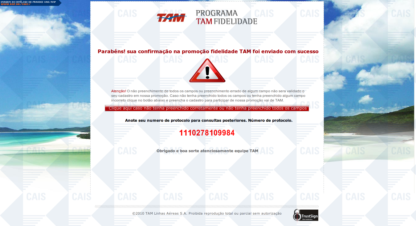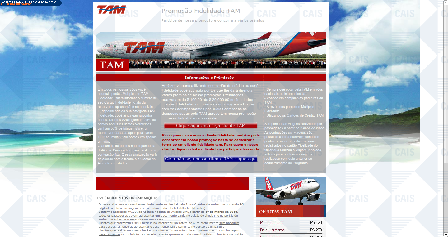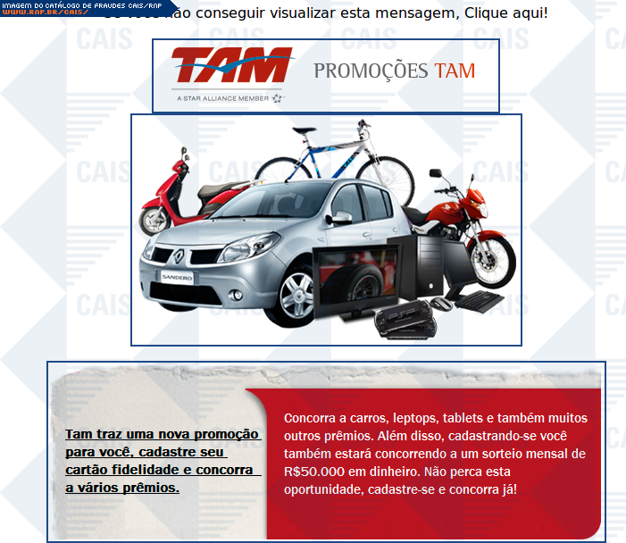 | comentário | A fraude contém um link para o cadastro em uma promoção da TAM. O link leva a uma página falsa destinada a coletar dados pessoais da víitma. | |