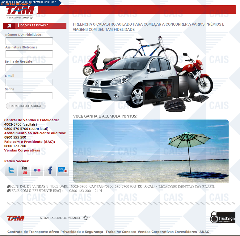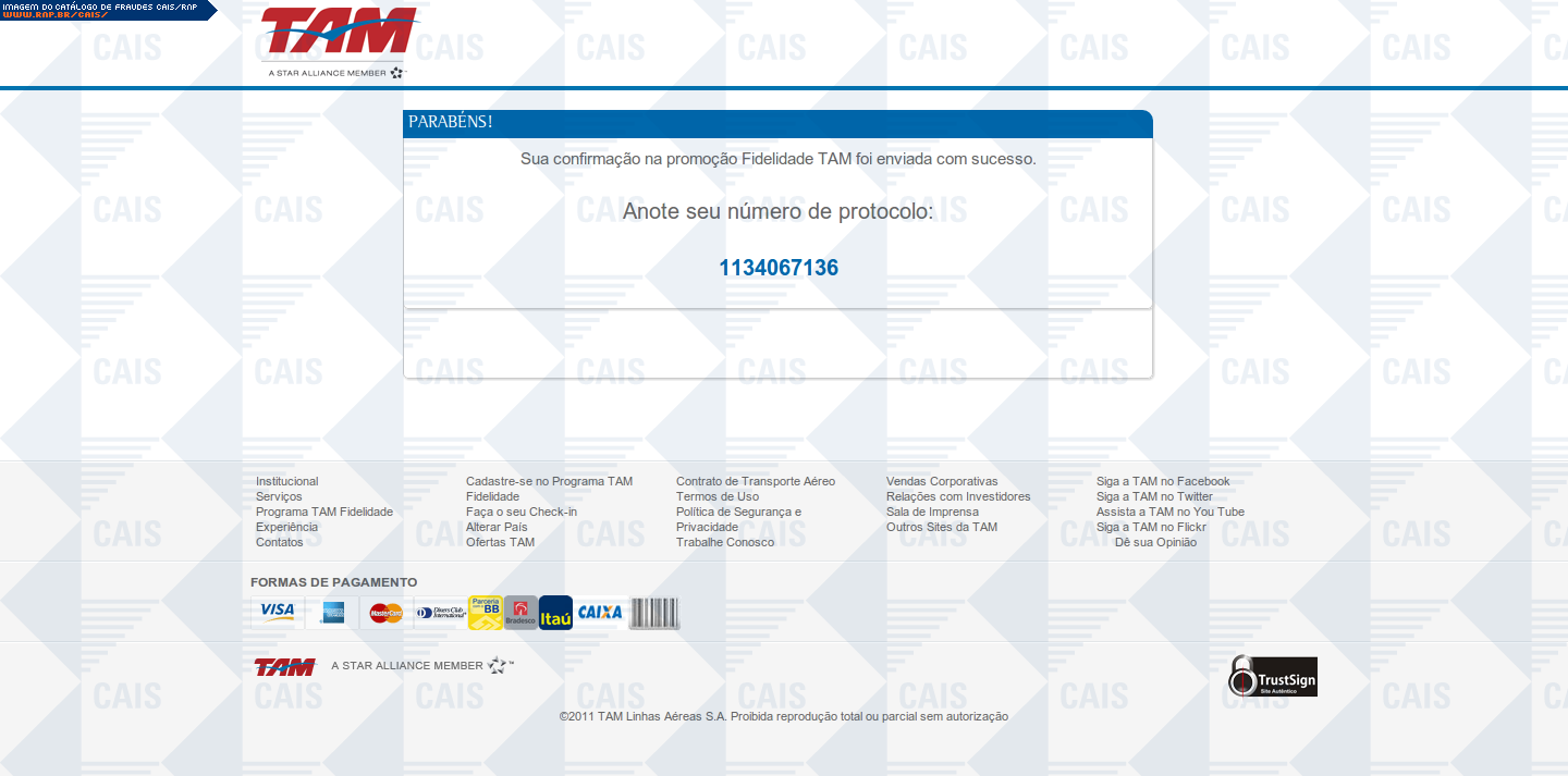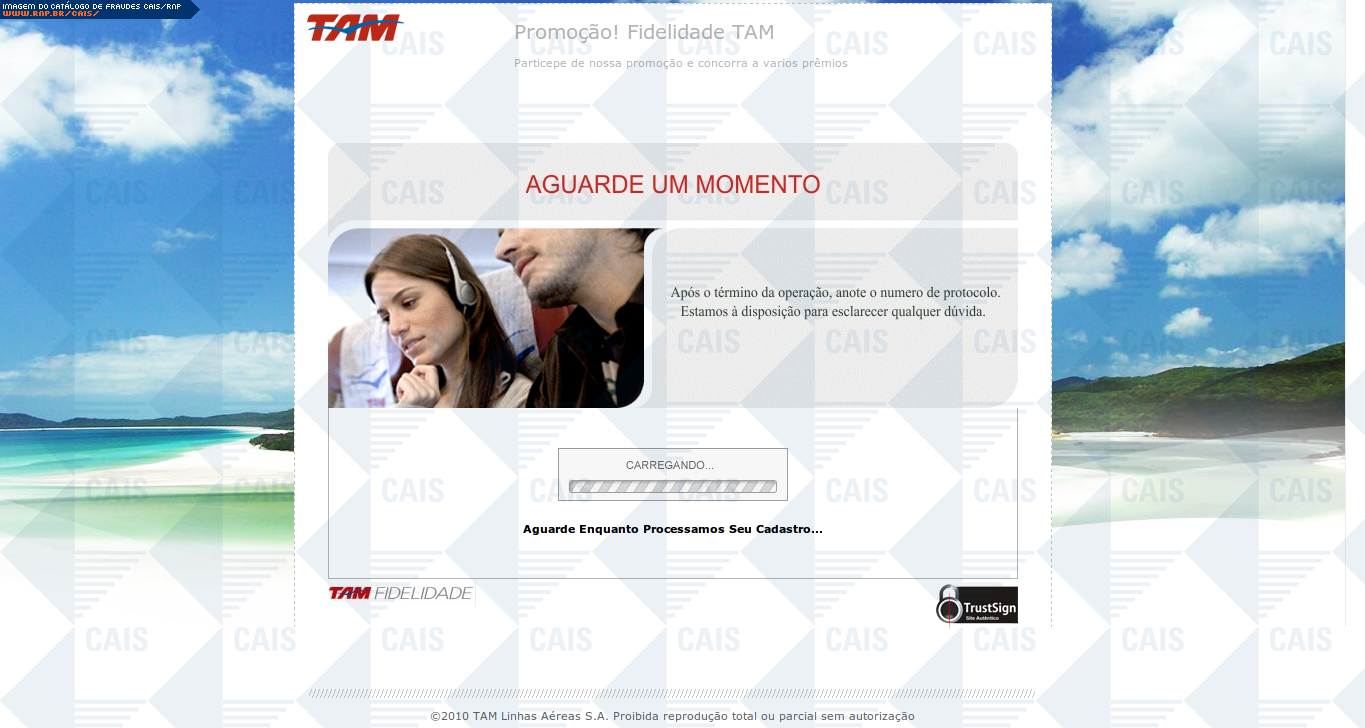| comentário | A fraude contém um link para o cadastro em uma promoção da TAM. O link leva a uma página falsa destinada a coletar dados pessoais da víitma. | |