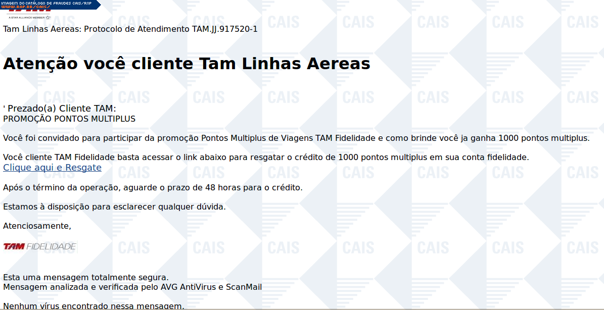 | comentário | A mensagem contém um link para o cadastro em uma promoção da TAM. O link leva a um site falso, destinado a coletar dados pessoais da vítima. | |
