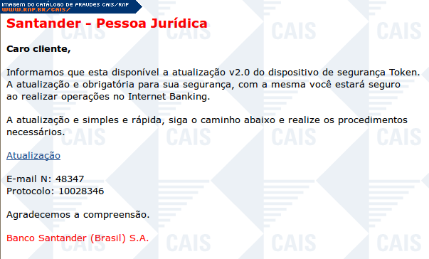 | comentário | A mensagem, em nome do banco Santander, contém um link para a atualização Token para a versão 2.0. O link leva ao software malicioso que foi identificado como Trojan.Win32.Spy (Ikarus). | |