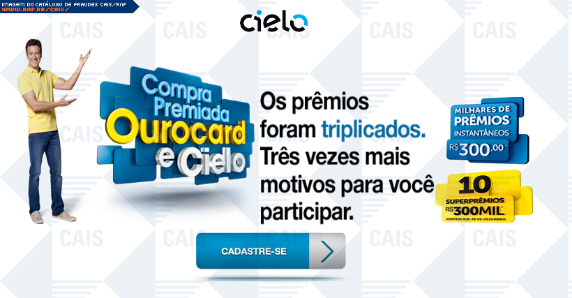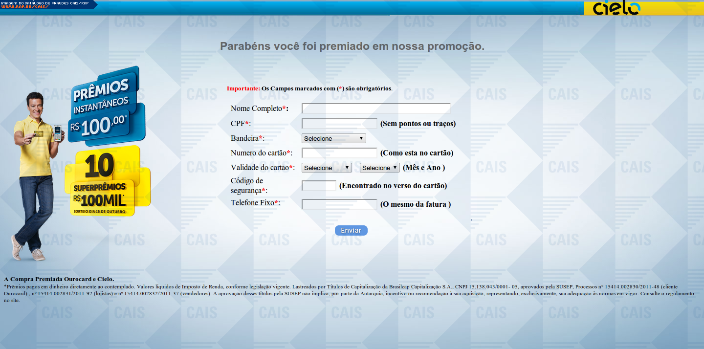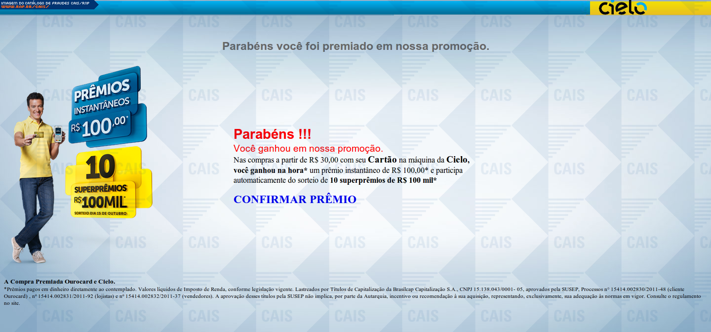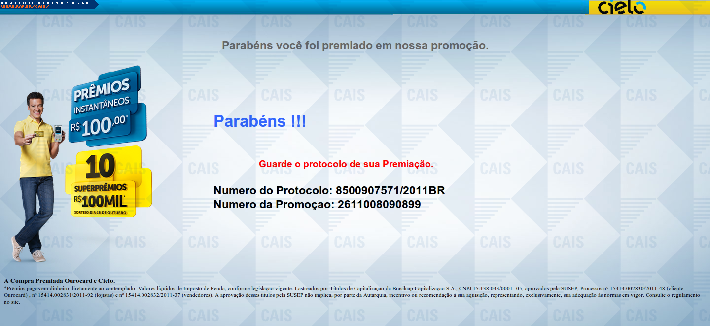| comentário | A mensagem contém um link para o cadastro em uma promoção da Cielo. O link leva a uma página que informa que a vítima foi sorteada na promoção e pede que a vítima informe seus dados pessoais. | |
