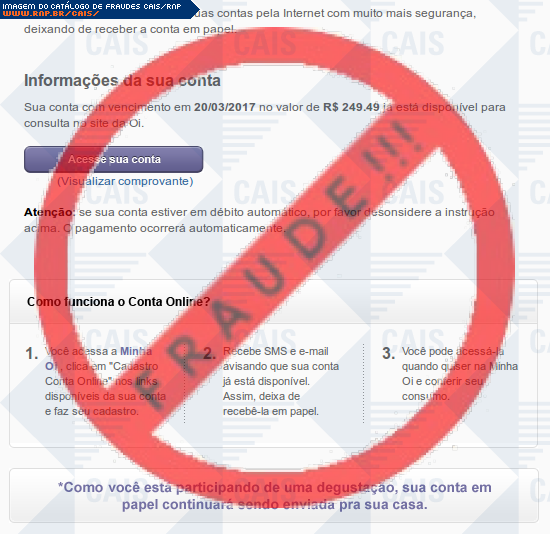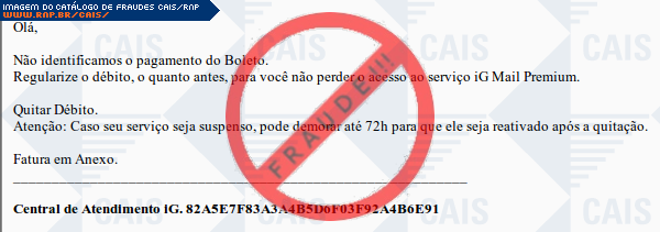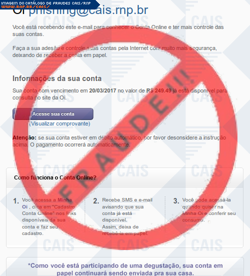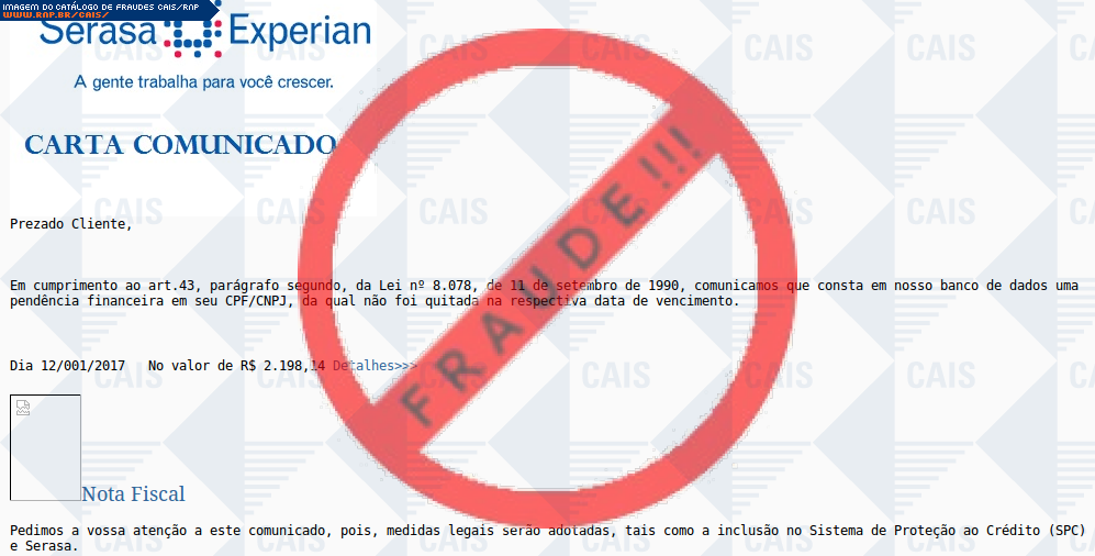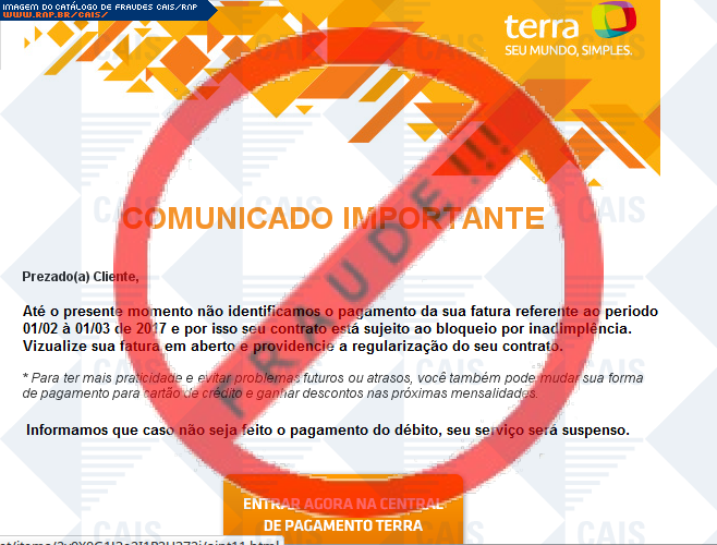 Esta página tem função informativa e educativa. Exibe uma coleção de imagens de phishing scam (fraudes eletrônicas) ou malware (código malicioso) veiculados por meio de spam (e-mail não-solicitado). Trata-se de conteúdo exemplificativo, não exaustivo, uma vez que não é possível contemplar todos os casos de fraudes existentes. Assim, caso você tenha conhecimento de um exemplar que não esteja aqui presente, isto não significa que não seja válido ou real. Inclusive incentivamos que você o envie para análise do CAIS para que, se for o caso, passe a integrar o nosso acervo.